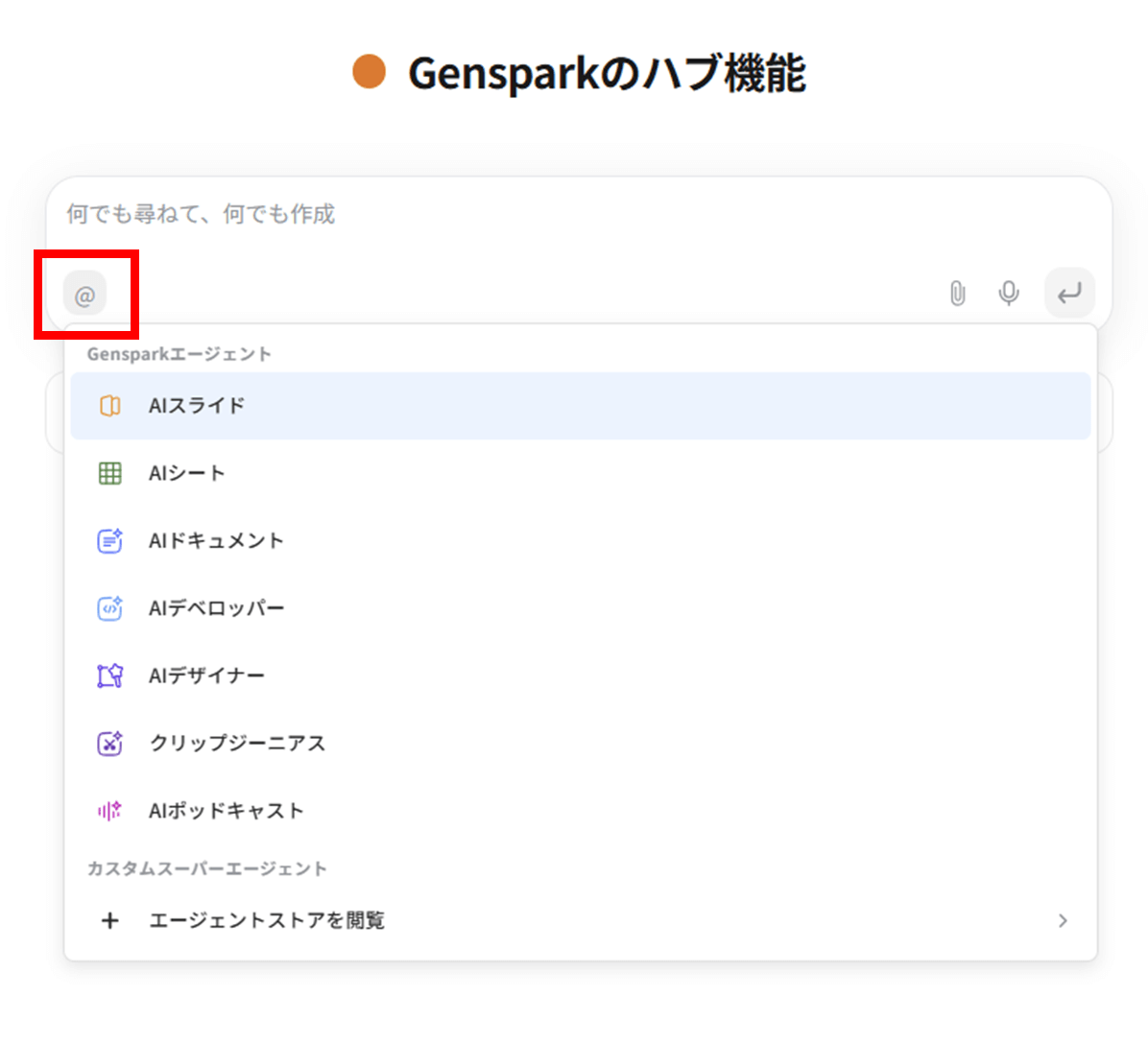 プロンプト欄の左下にある「@」のアイコンをクリックすると、スライド作成エージェントやデザインエージェントなど、GensparkのAIエージェント機能をハブ内で使用することができます。