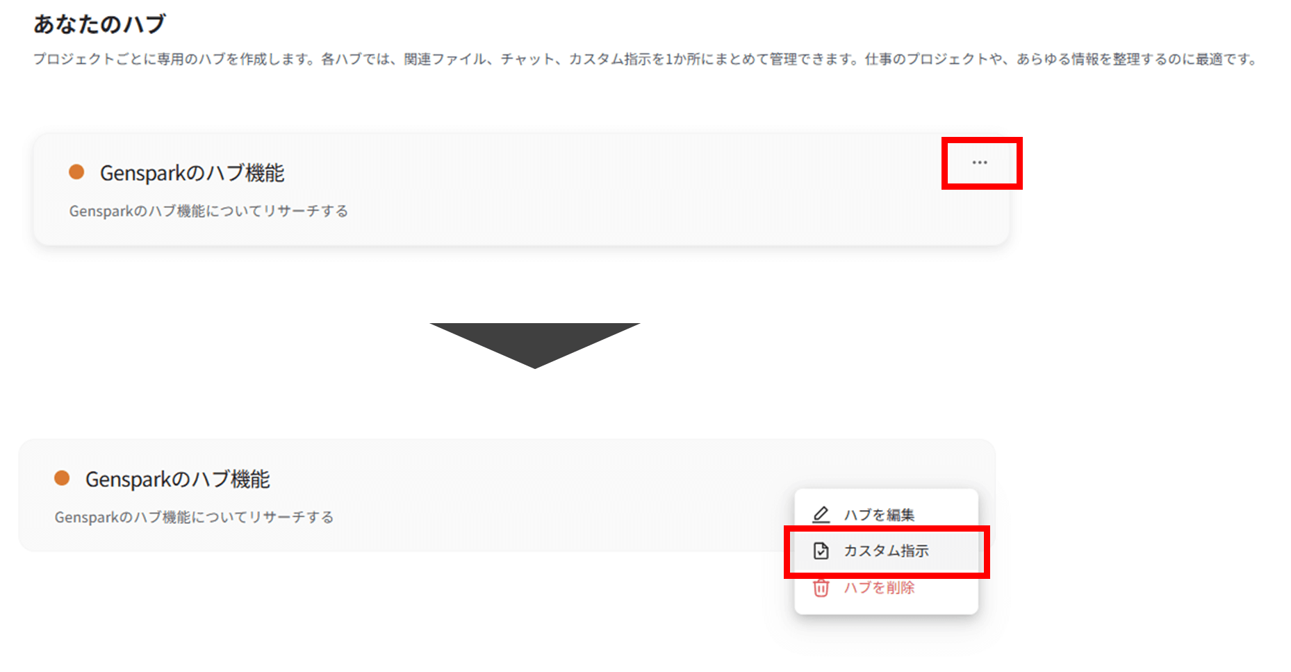 「あなたのハブ」画面から対象のハブにカーソルを合わせ、「…」のアイコンをクリックして「カスタム指示」を選択します。