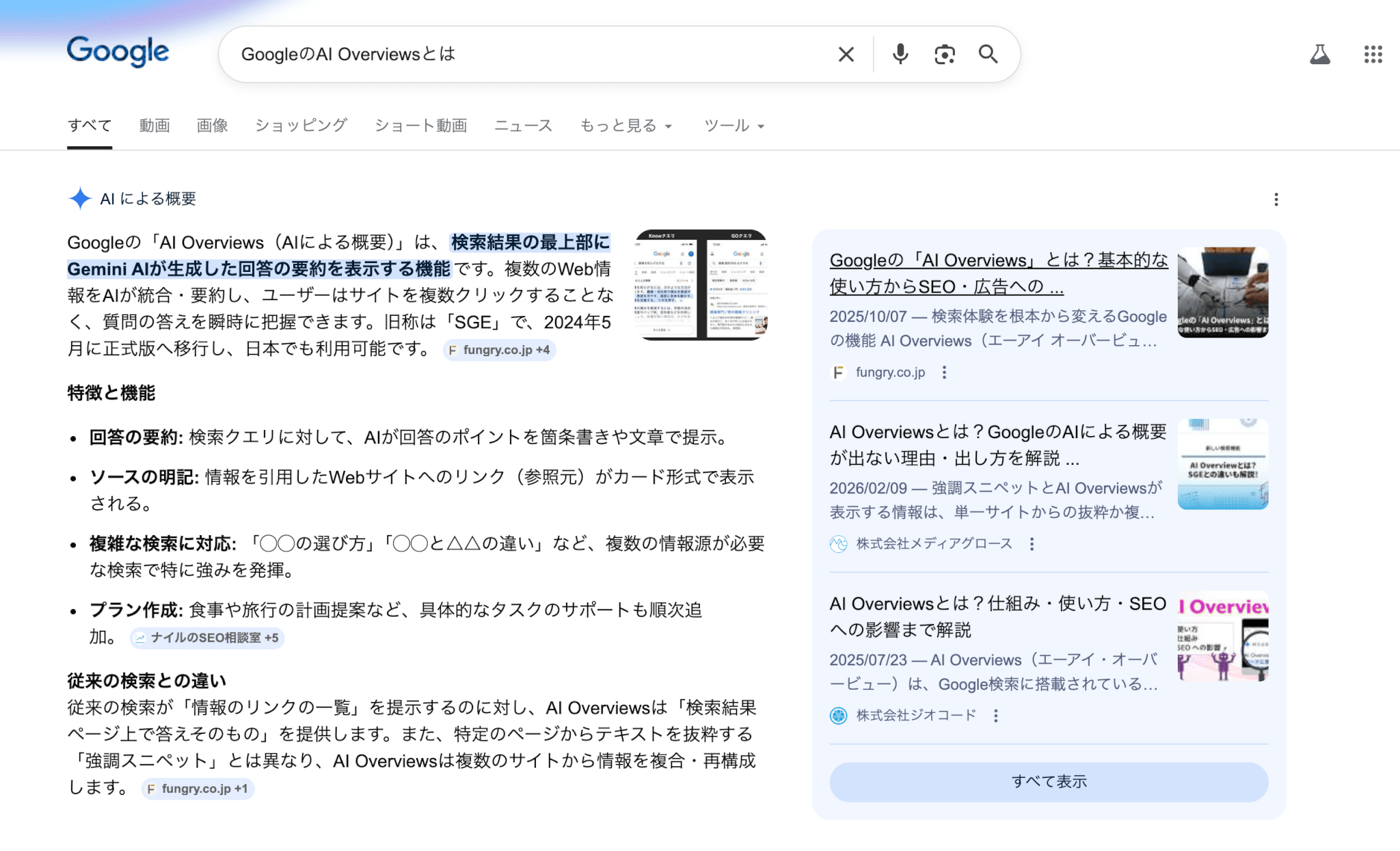 GoogleのAI Overviewsが表示される場合は、検索結果のトップに概要を表示しますが、その下には豊富なWebサイトのリスト、広告、地図情報、ショッピング機能などが並びます。