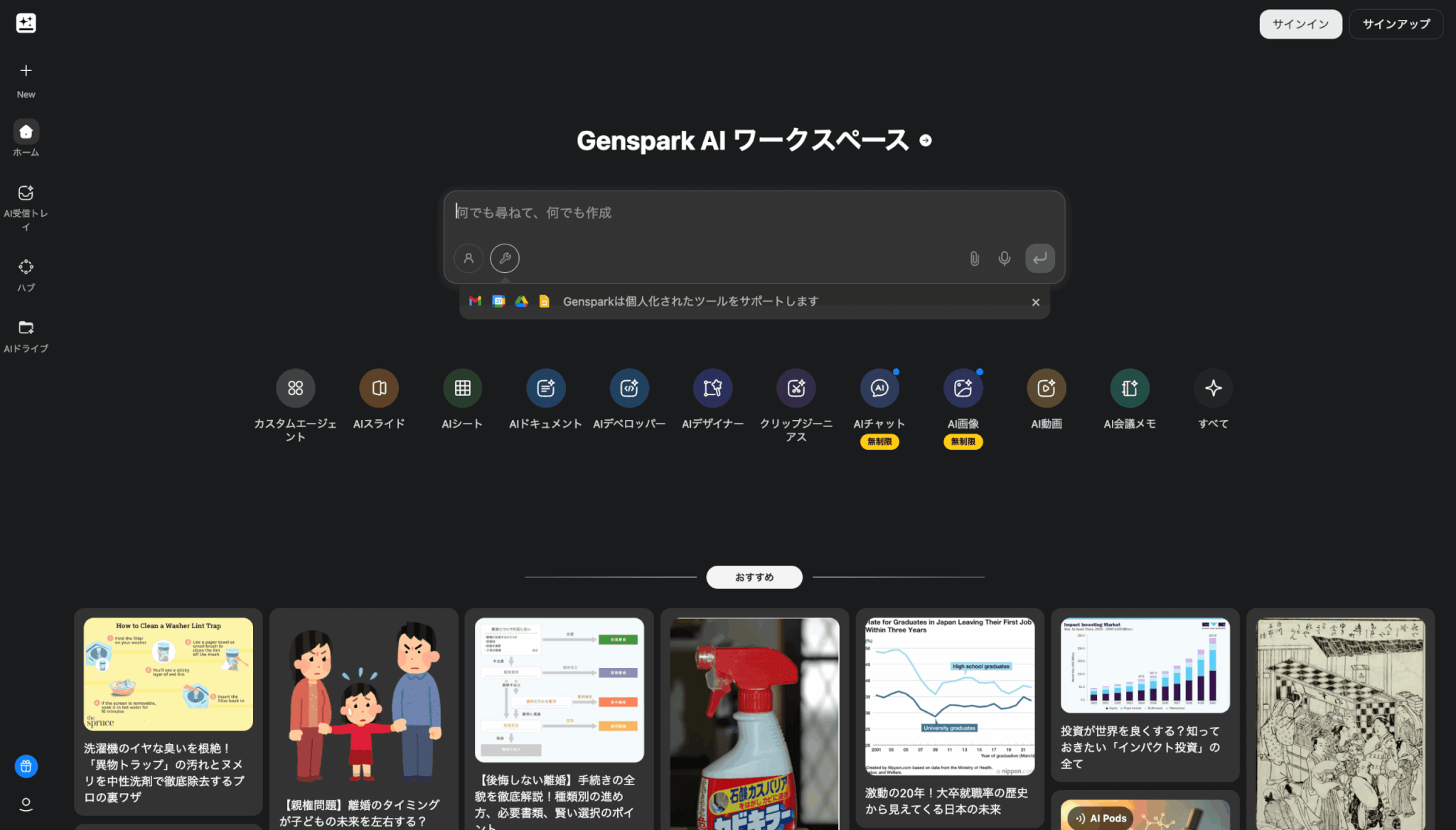 調査結果をそのままプレゼン資料化できる「AIスライド」や「AIドキュメント」、AIブラウザである「Genspark AI Browser」を提供するなど、検索からアウトプットまでを完結させるAIワークスペースへと進化しています。