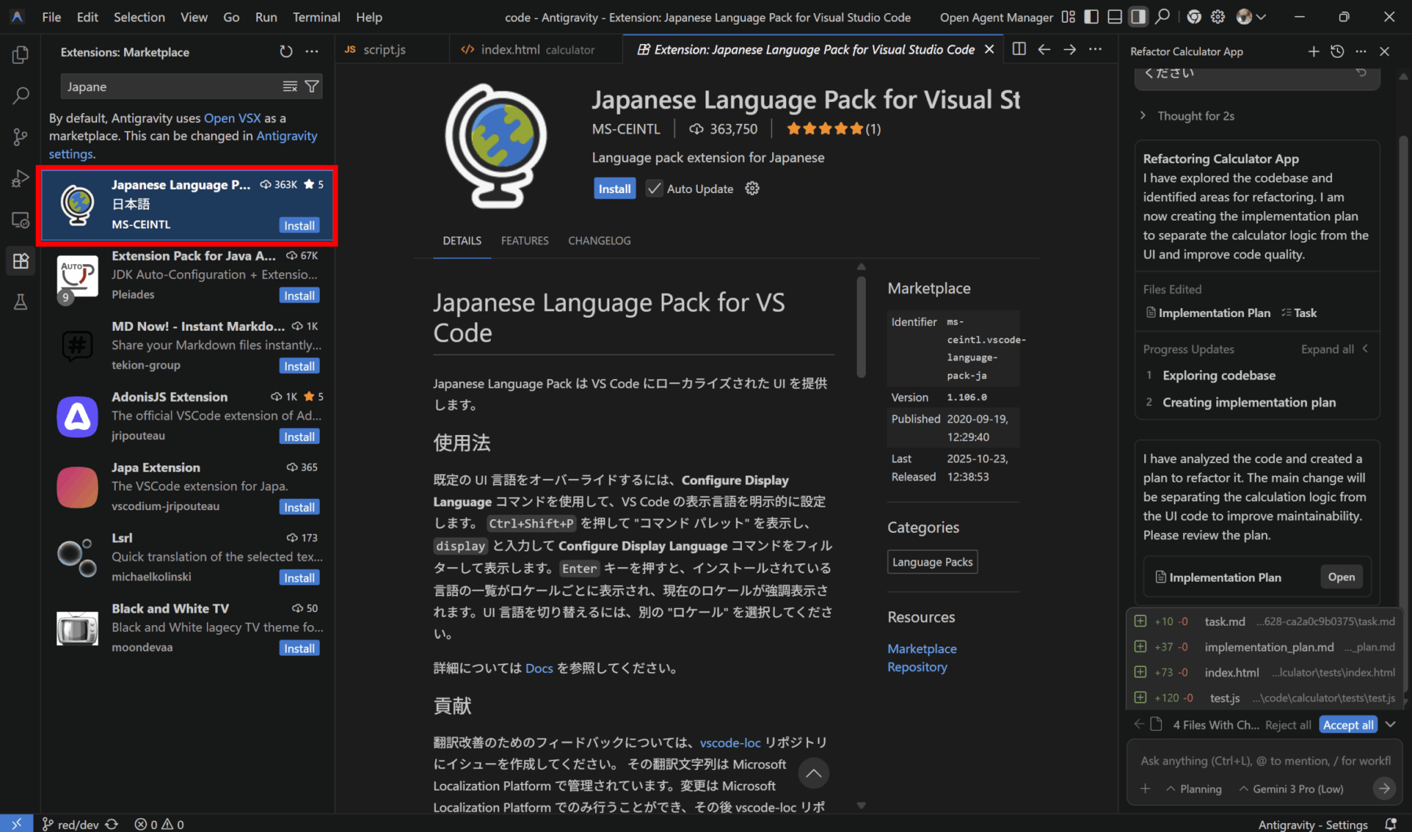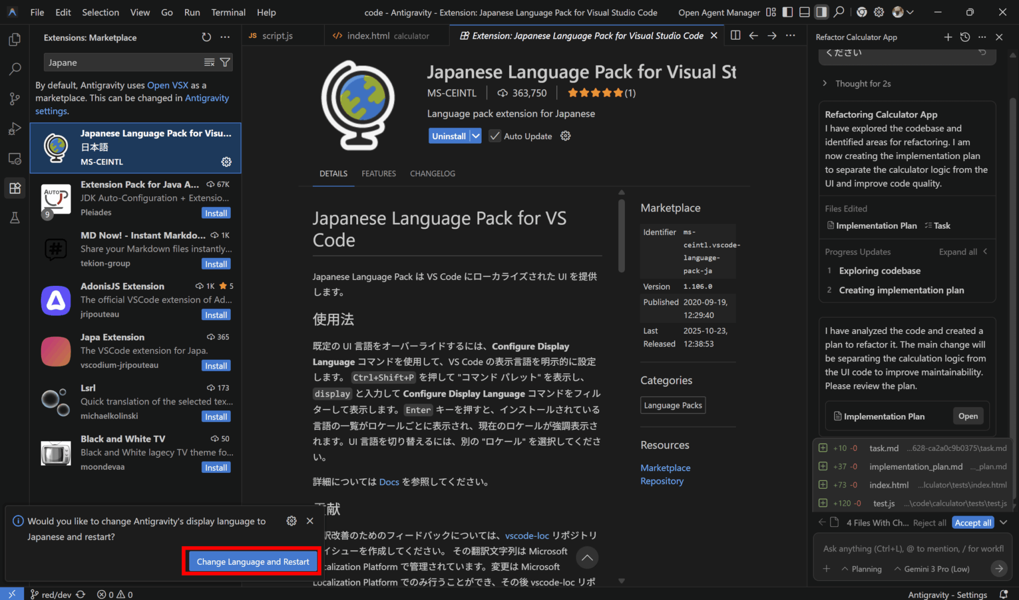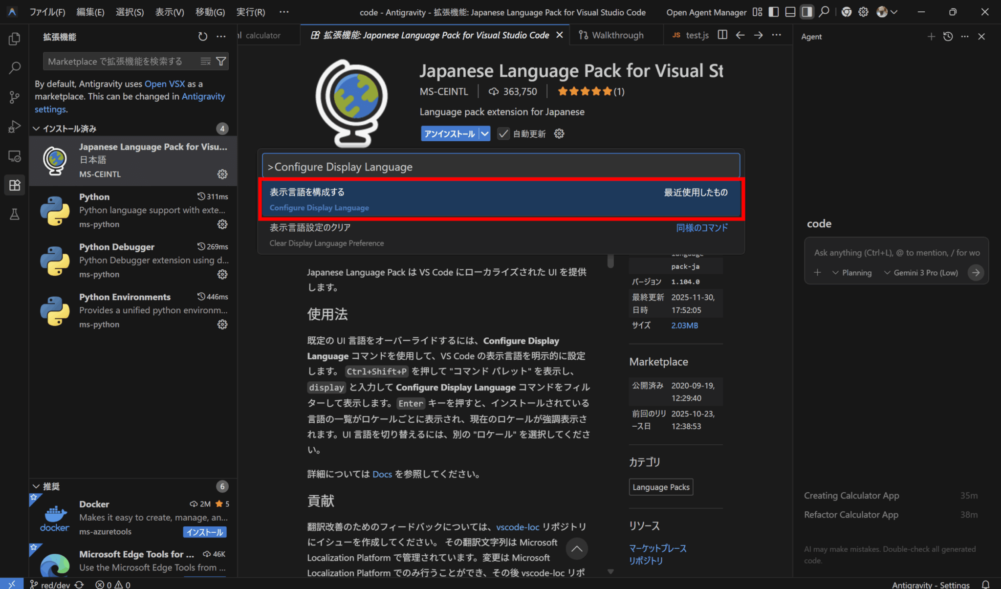 AntigravityはVS Codeをもとに作られているため、拡張機能の「Japanese Language Pack for VS Code」をインストールすることで日本語化が可能です。