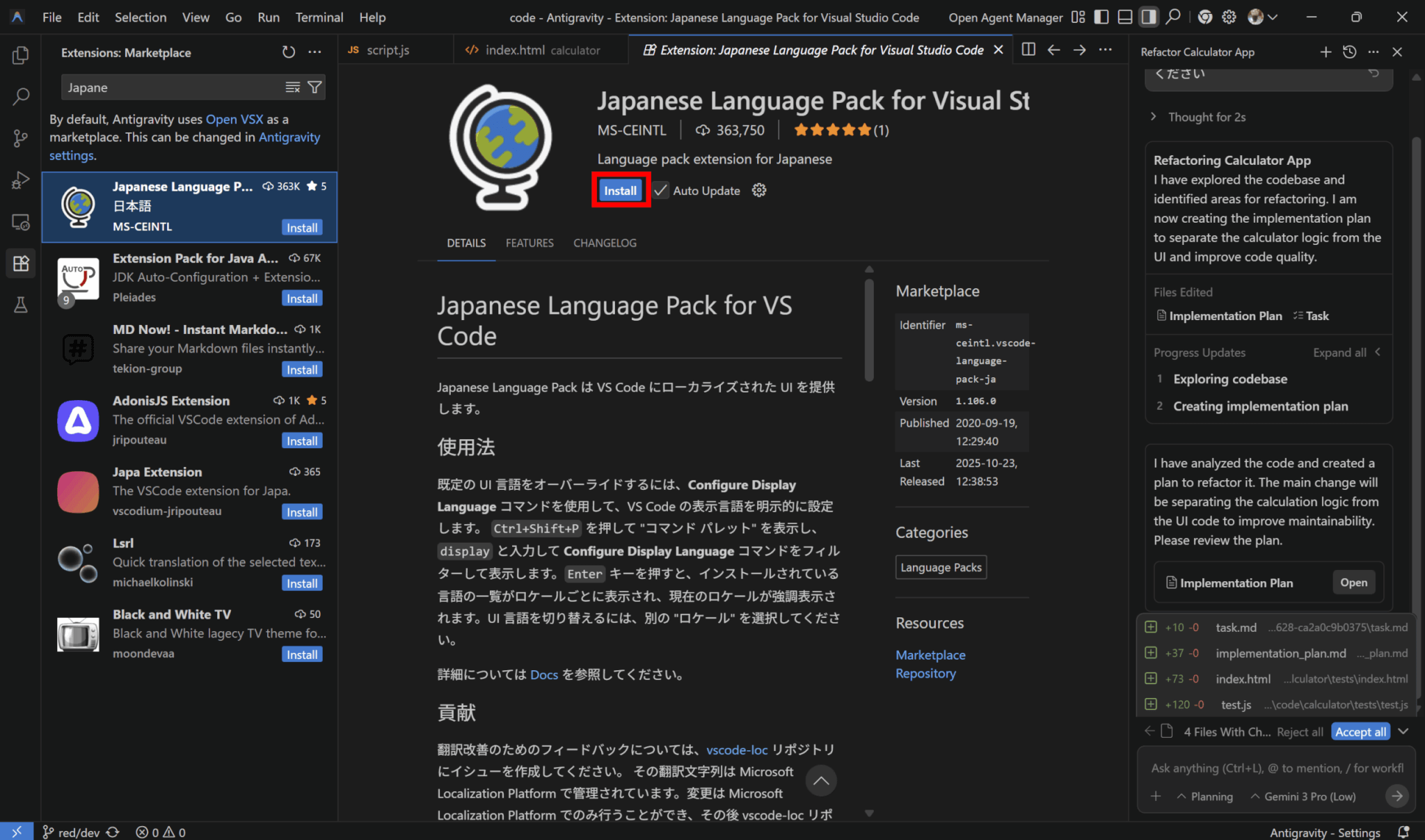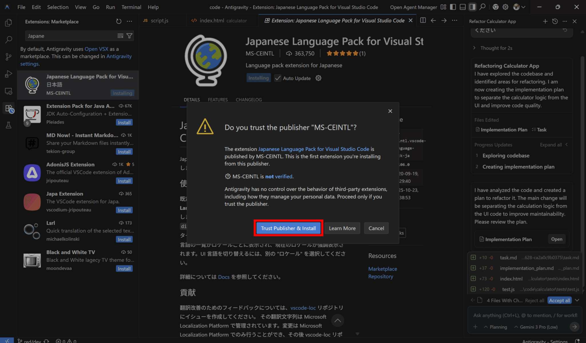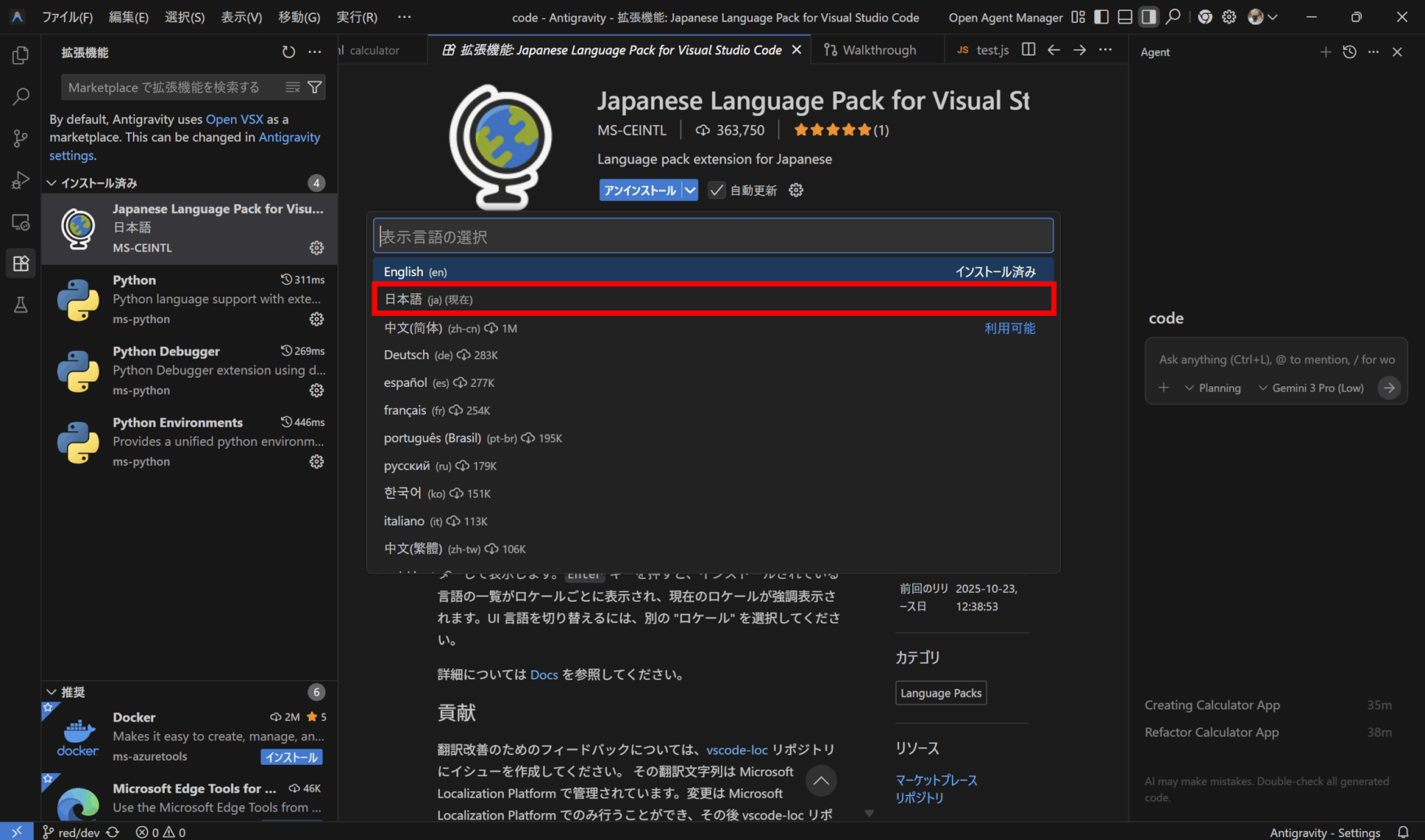 AntigravityはVS Codeをもとに作られているため、拡張機能の「Japanese Language Pack for VS Code」をインストールすることで日本語化が可能です。