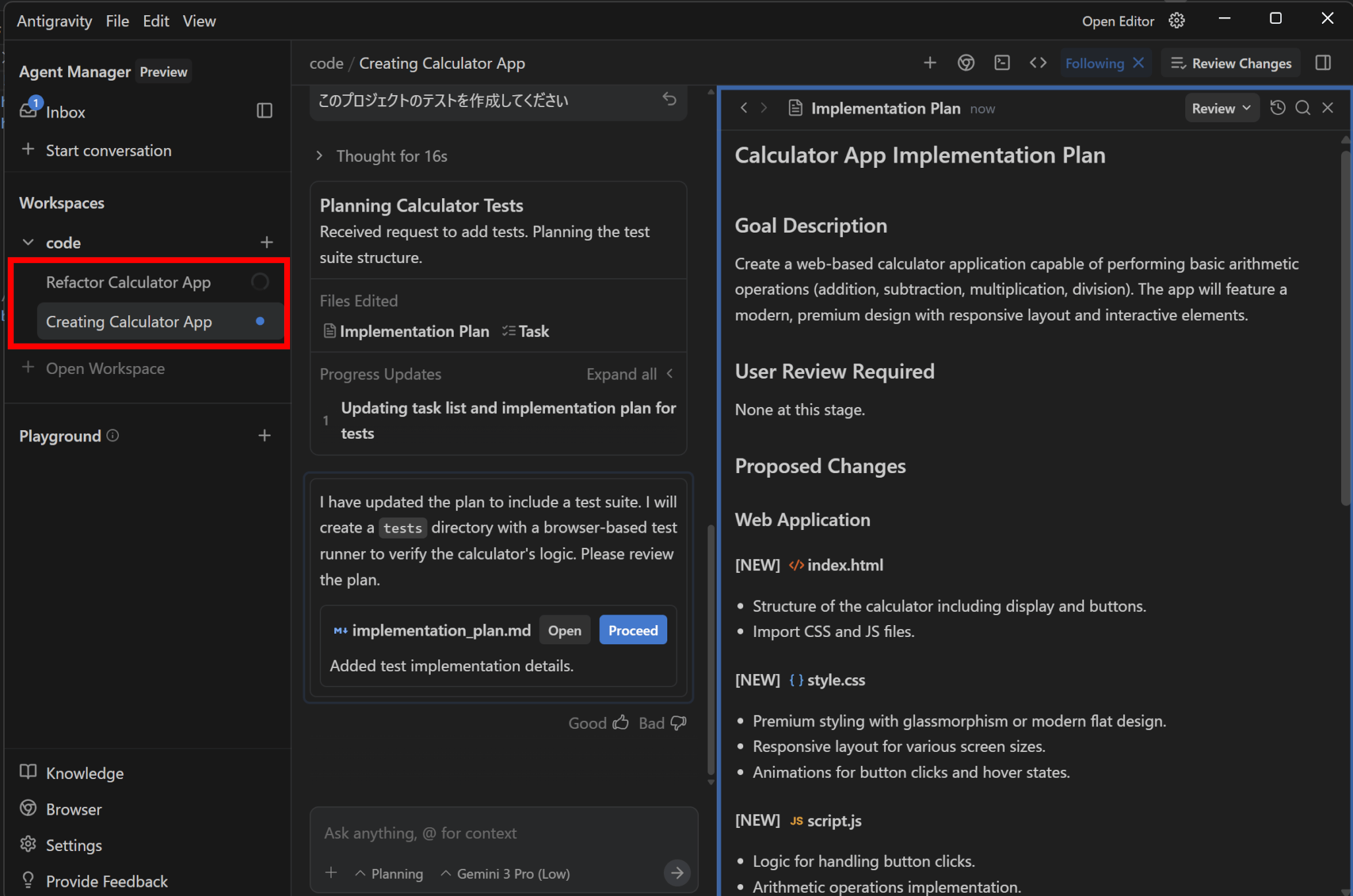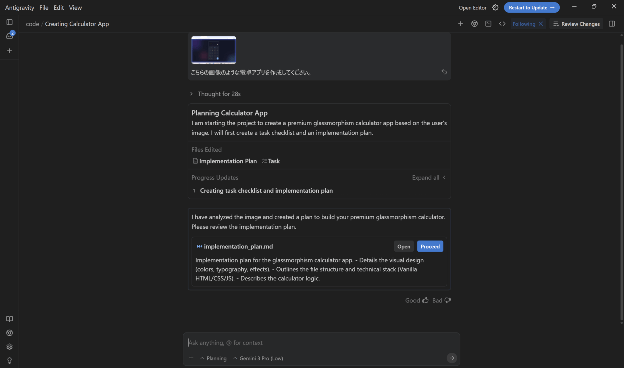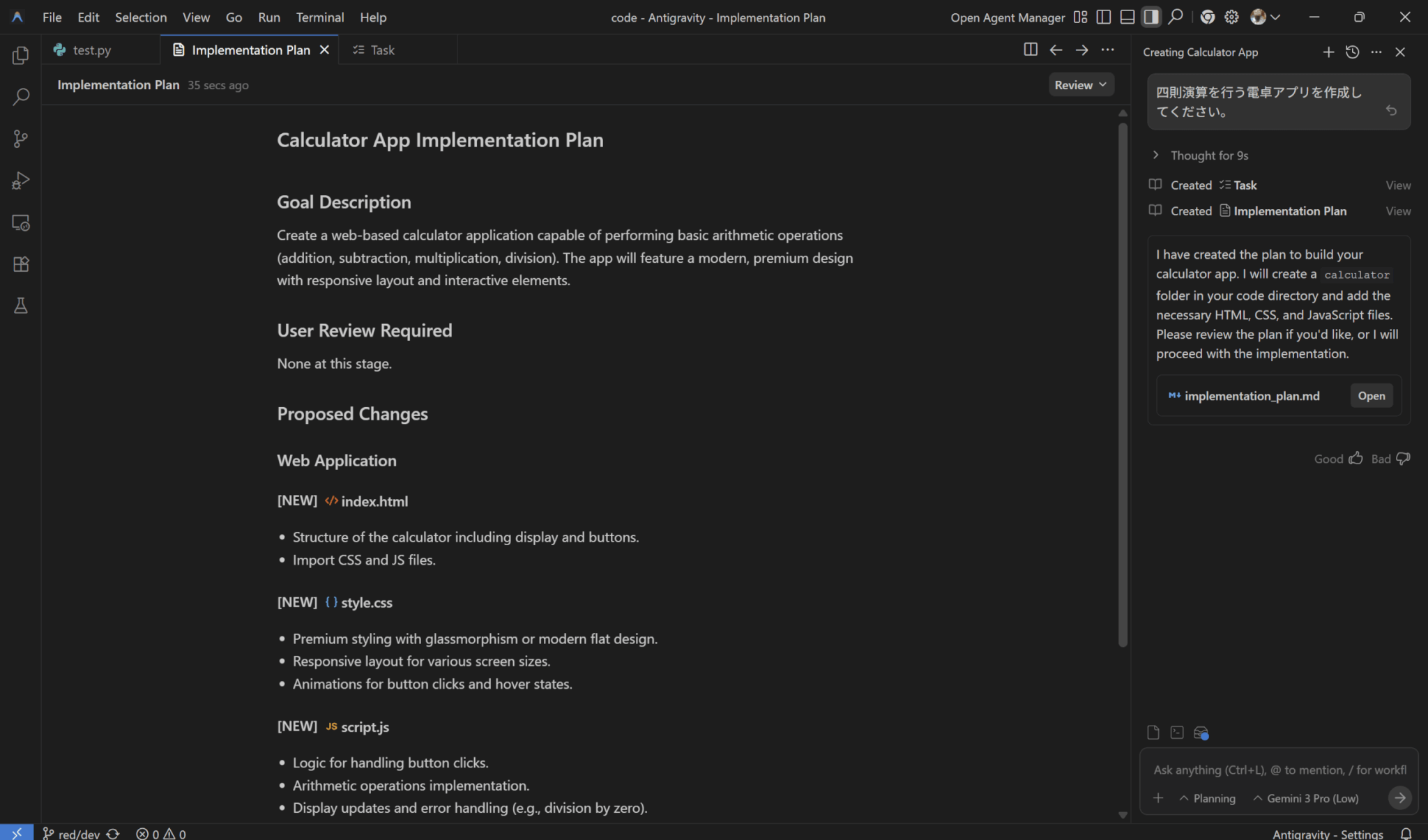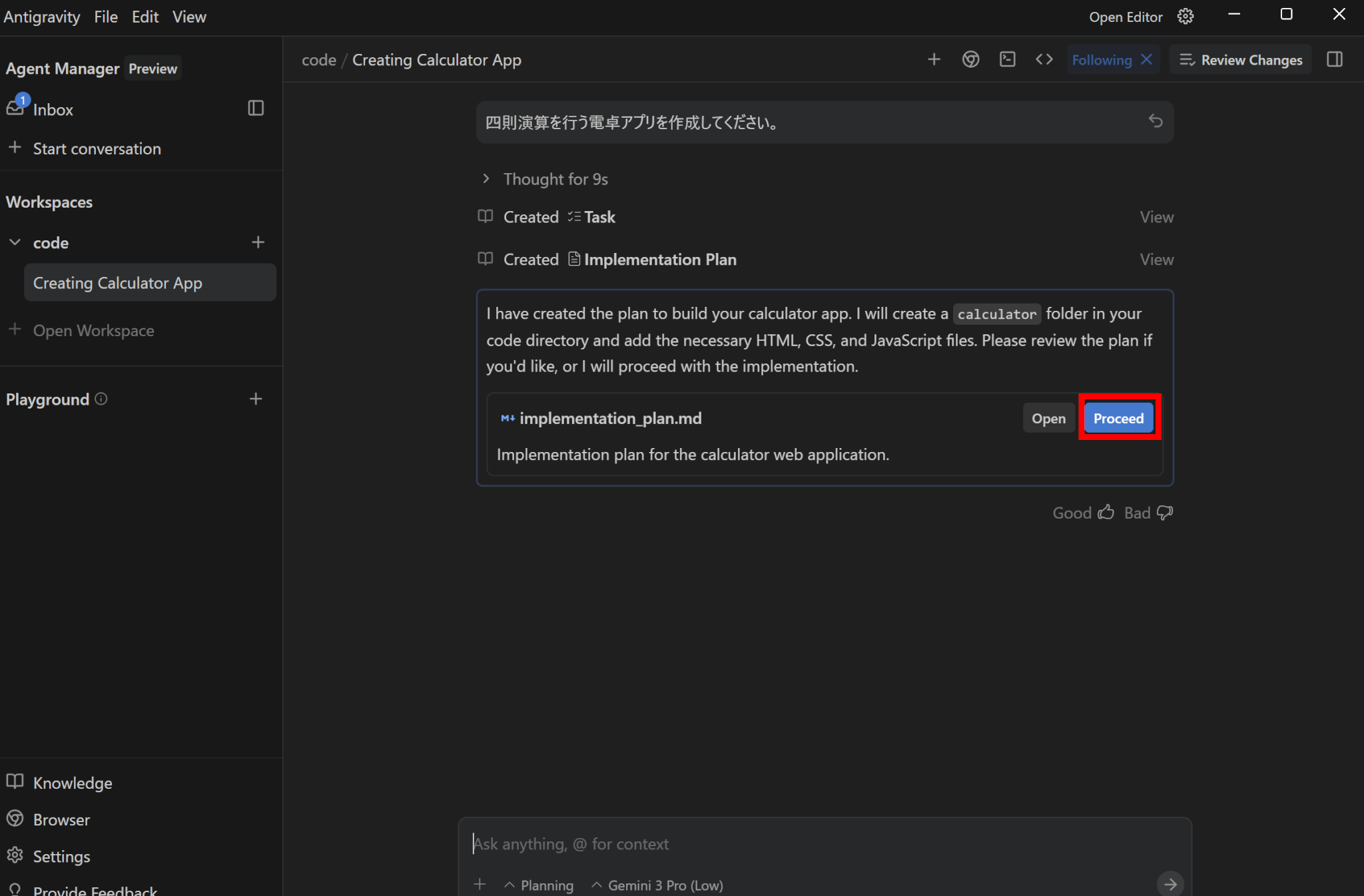 今回はPlanningとGemini 3 Pro(Low)を選択し、電卓アプリを作成してもらいました。