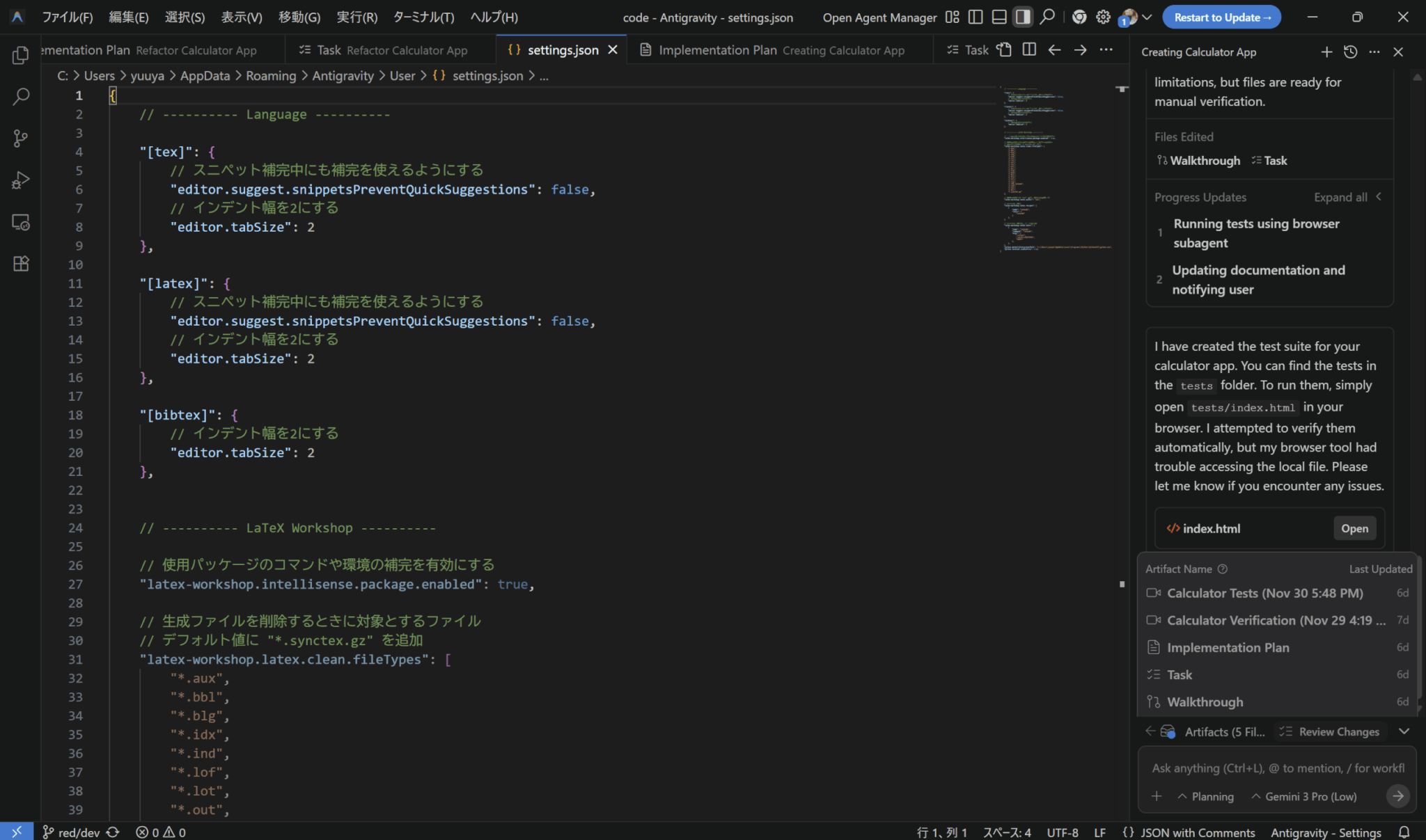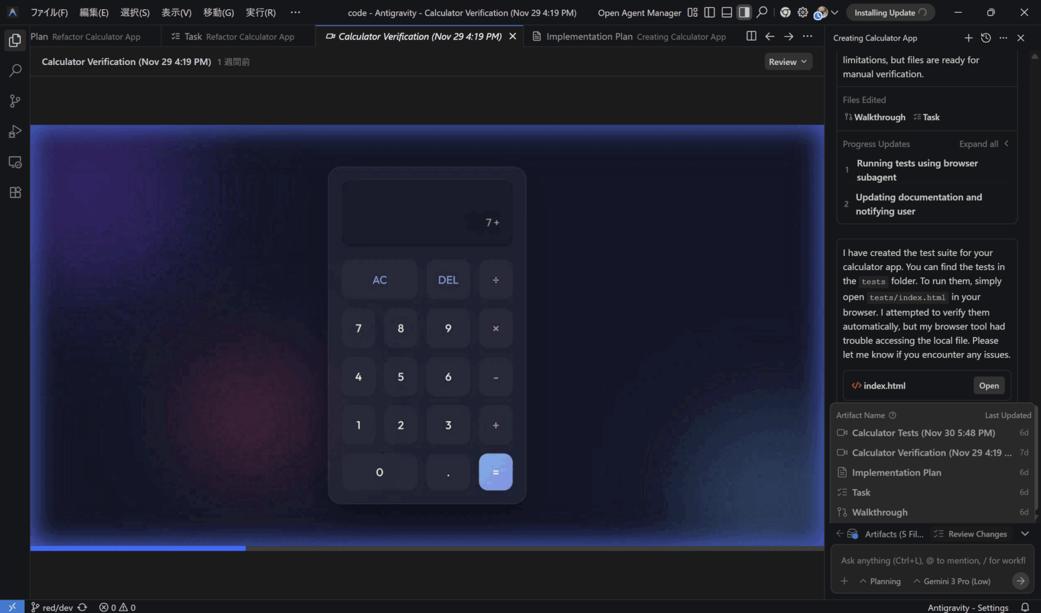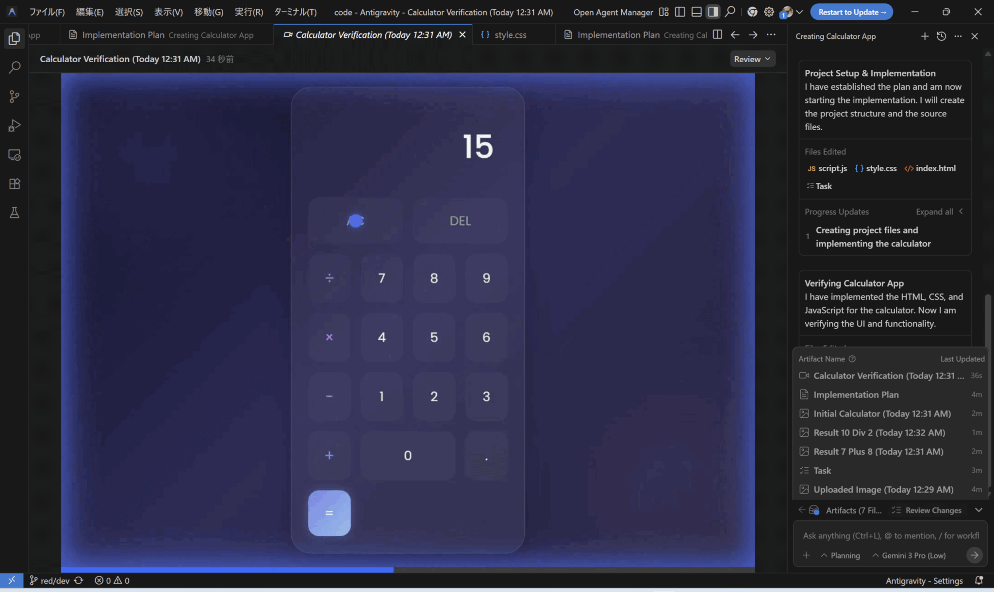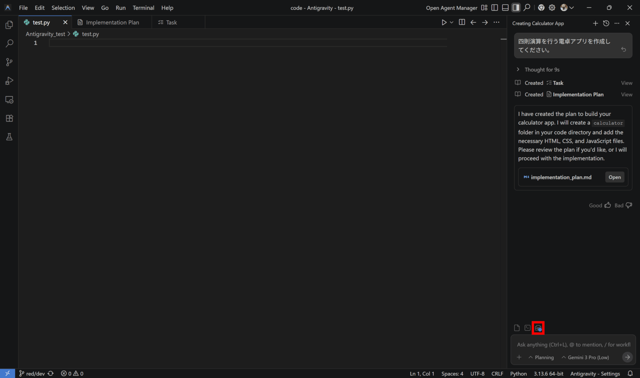 今回はPlanningとGemini 3 Pro(Low)を選択し、電卓アプリを作成してもらいました。