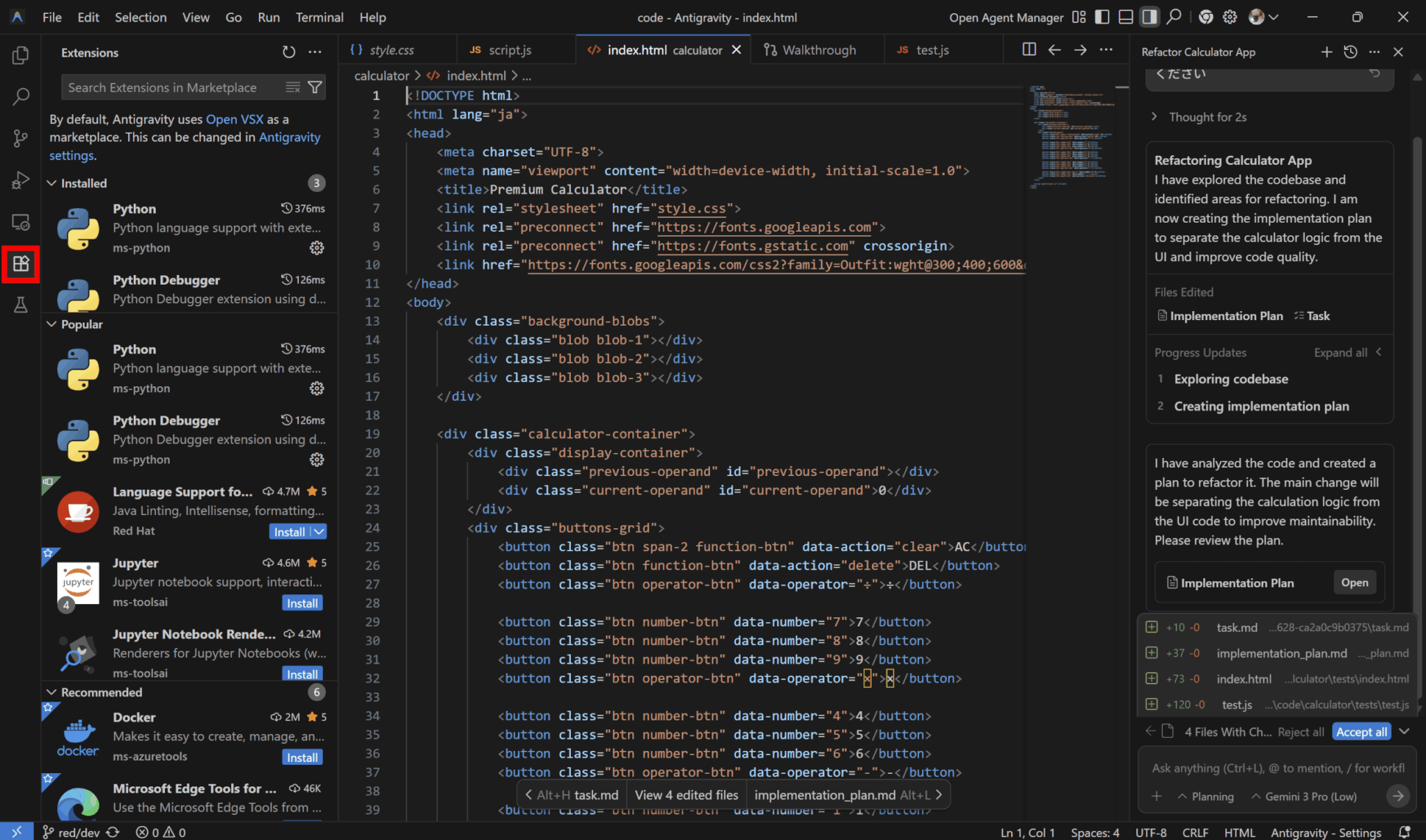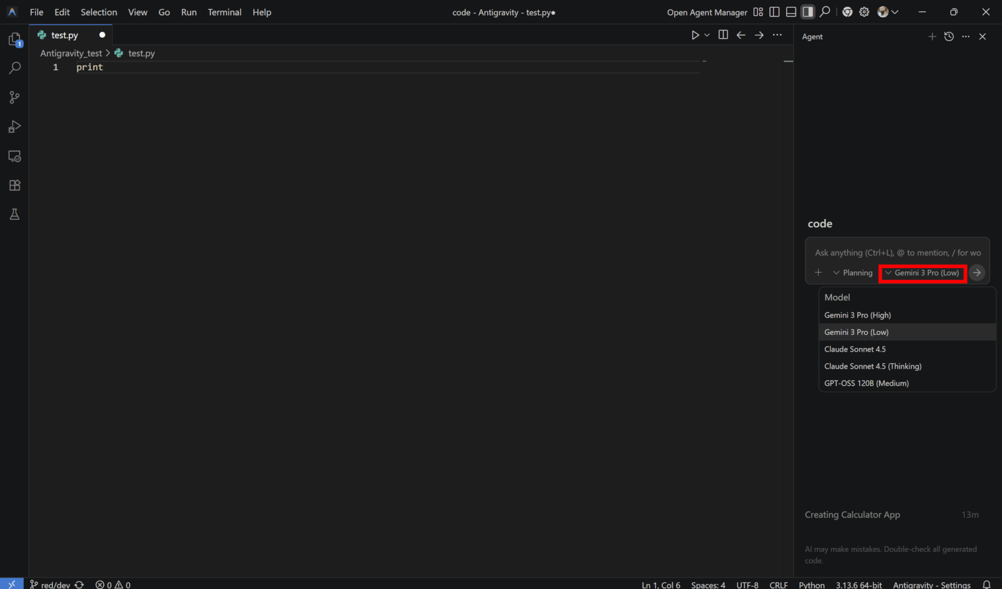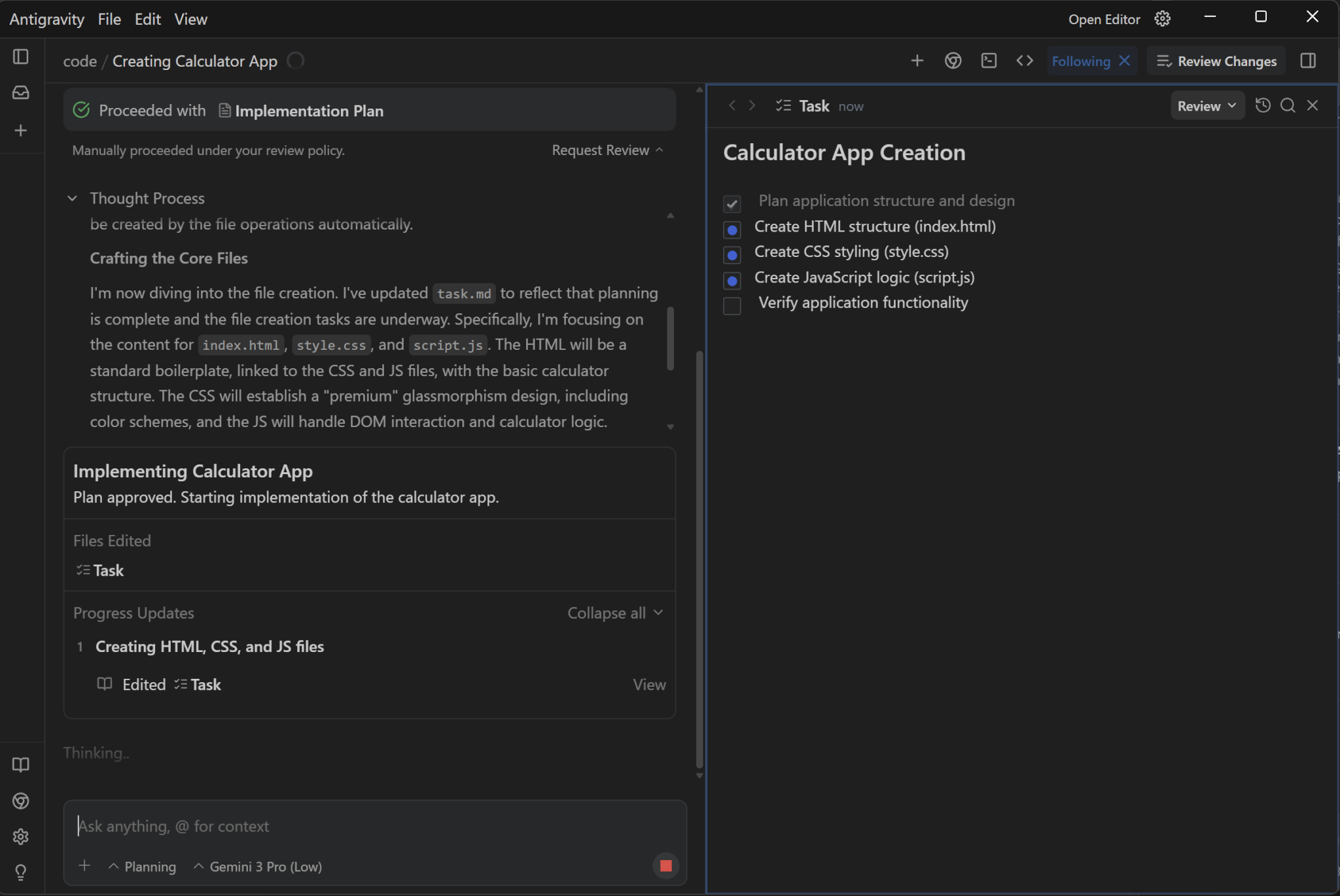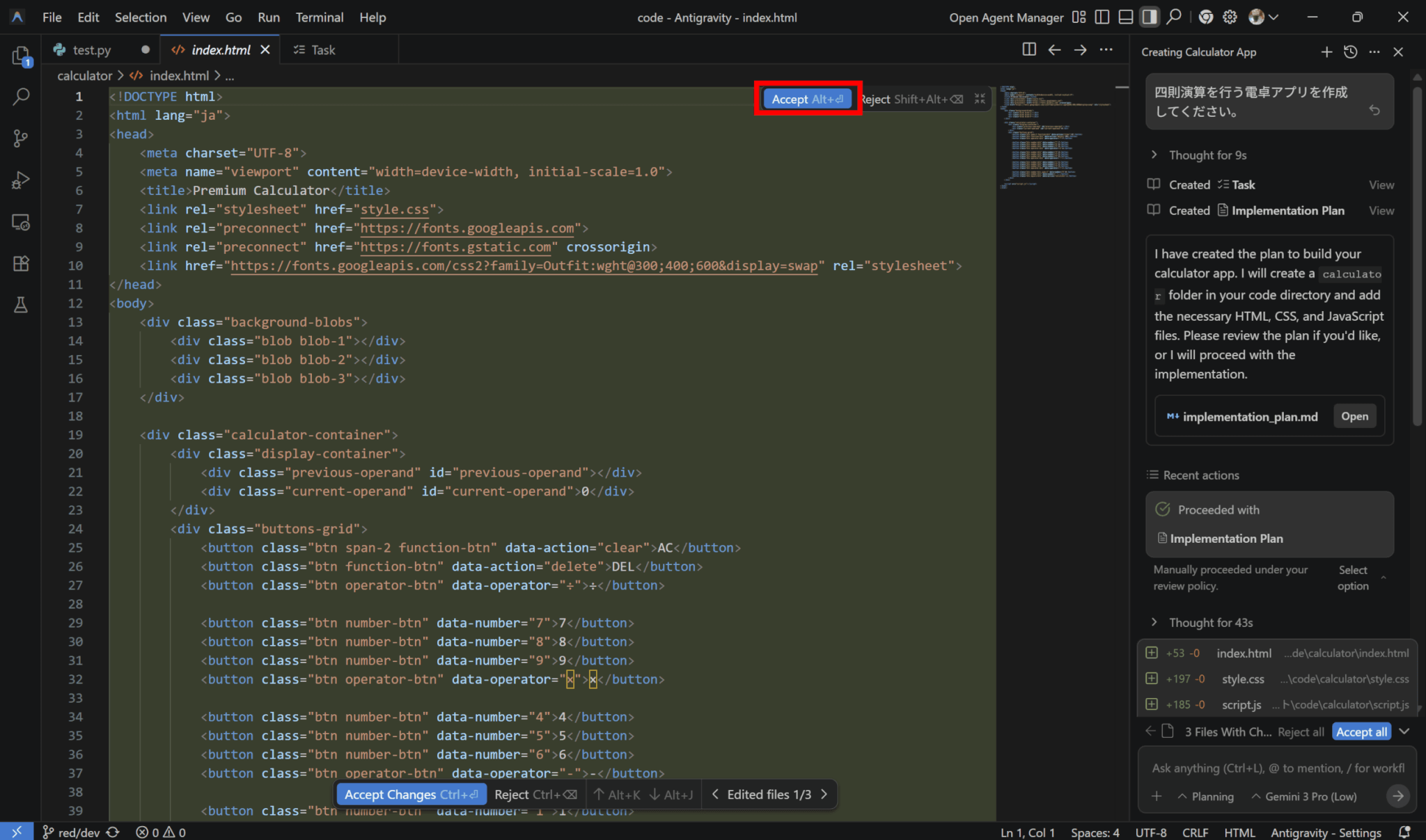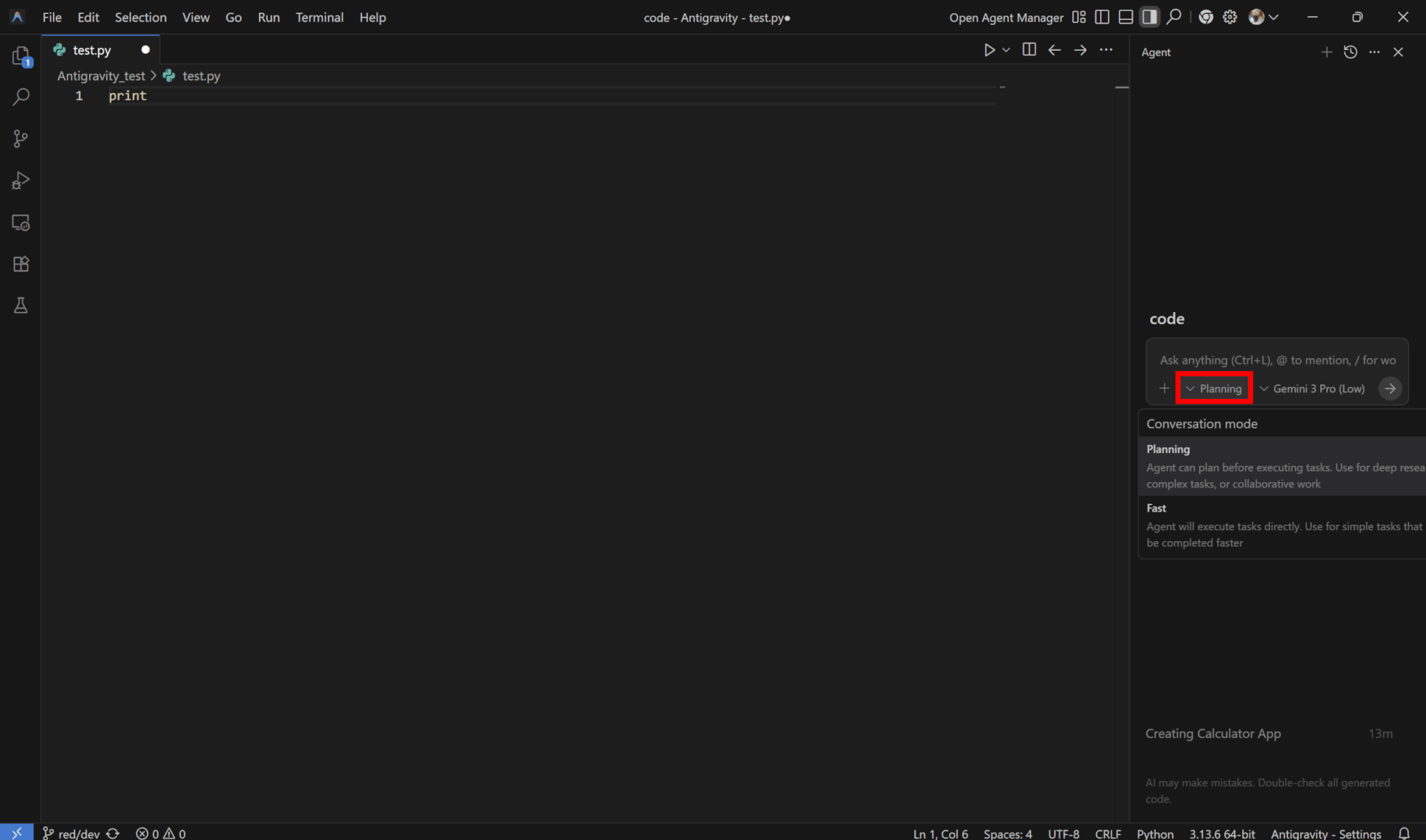 今回はPlanningとGemini 3 Pro(Low)を選択し、電卓アプリを作成してもらいました。
