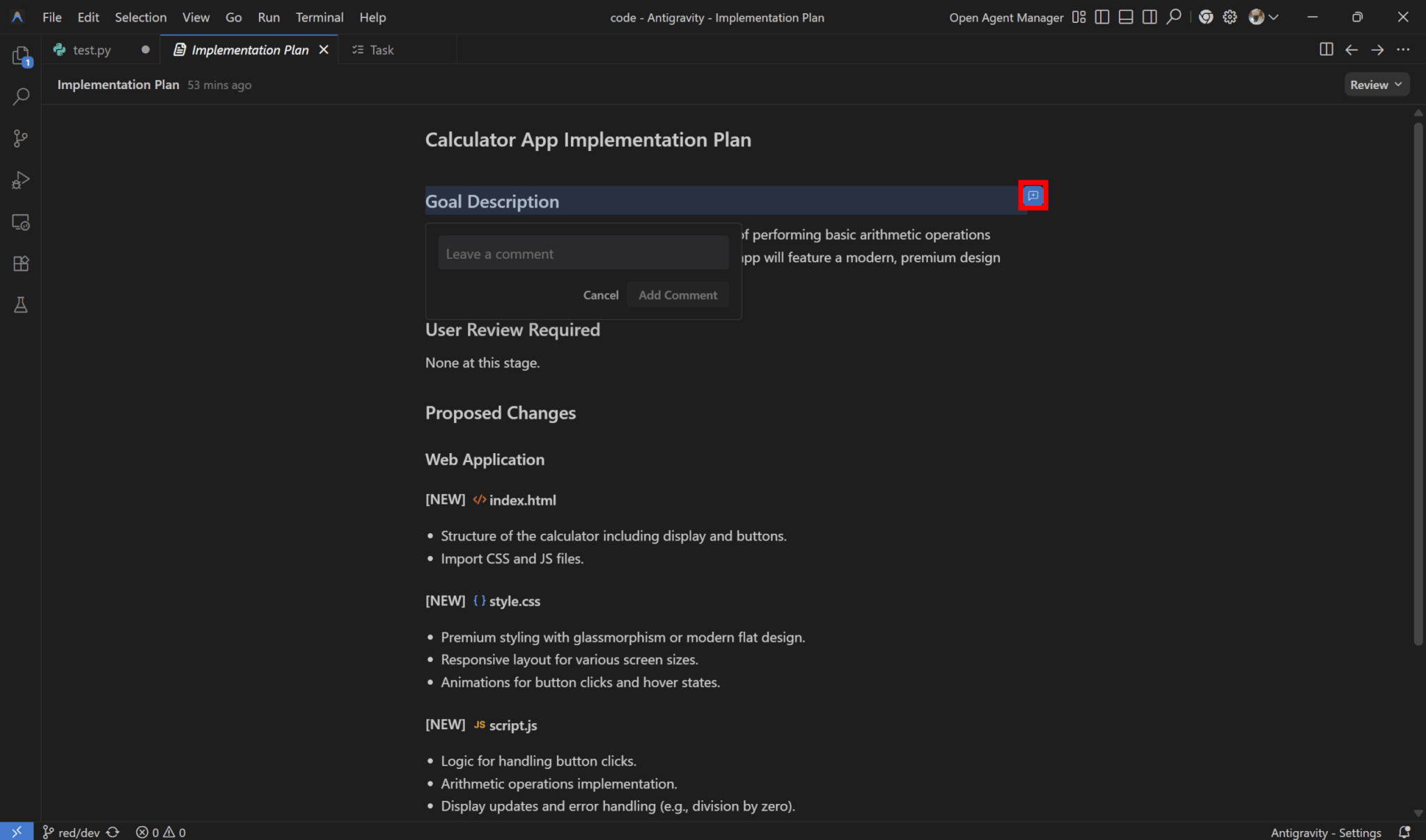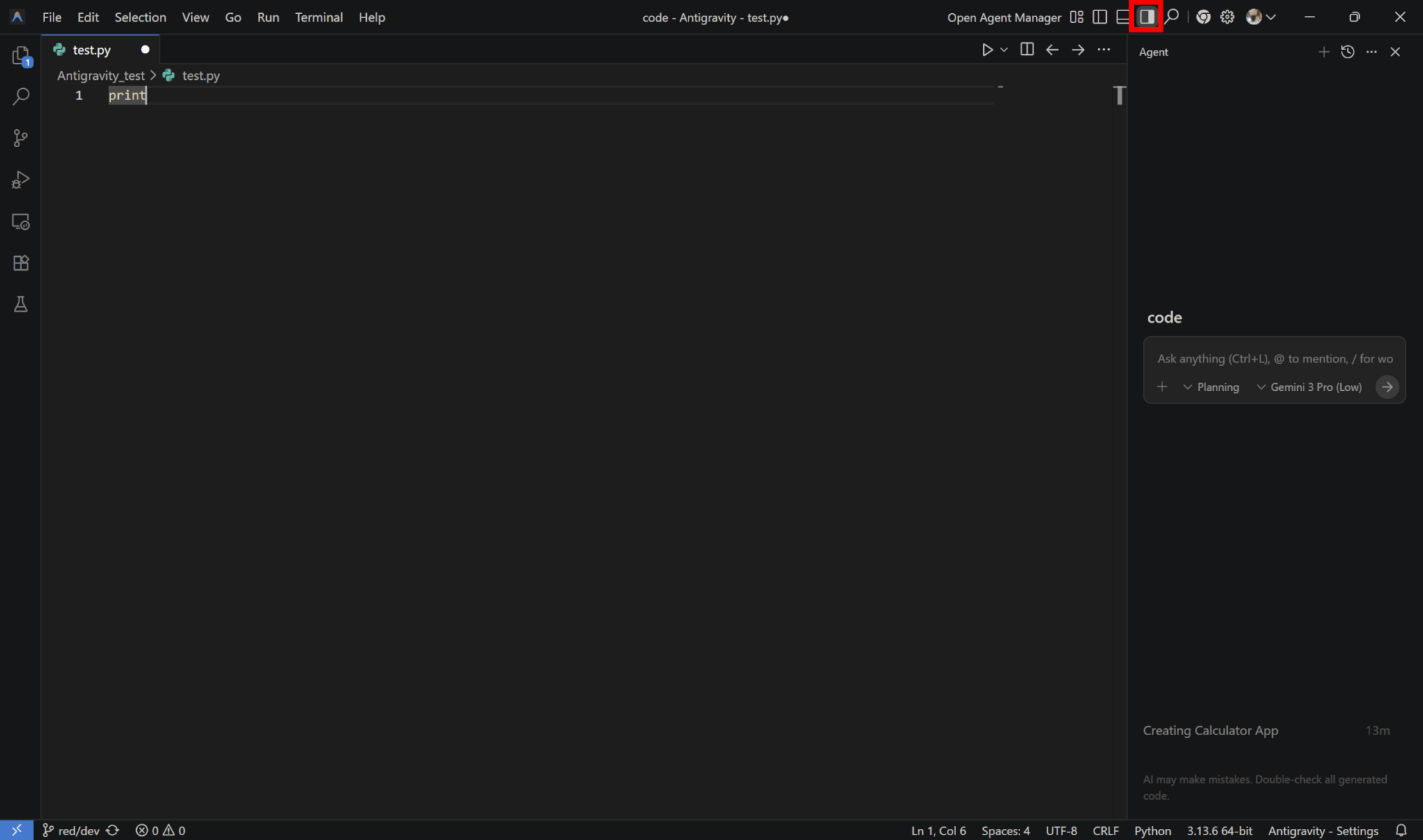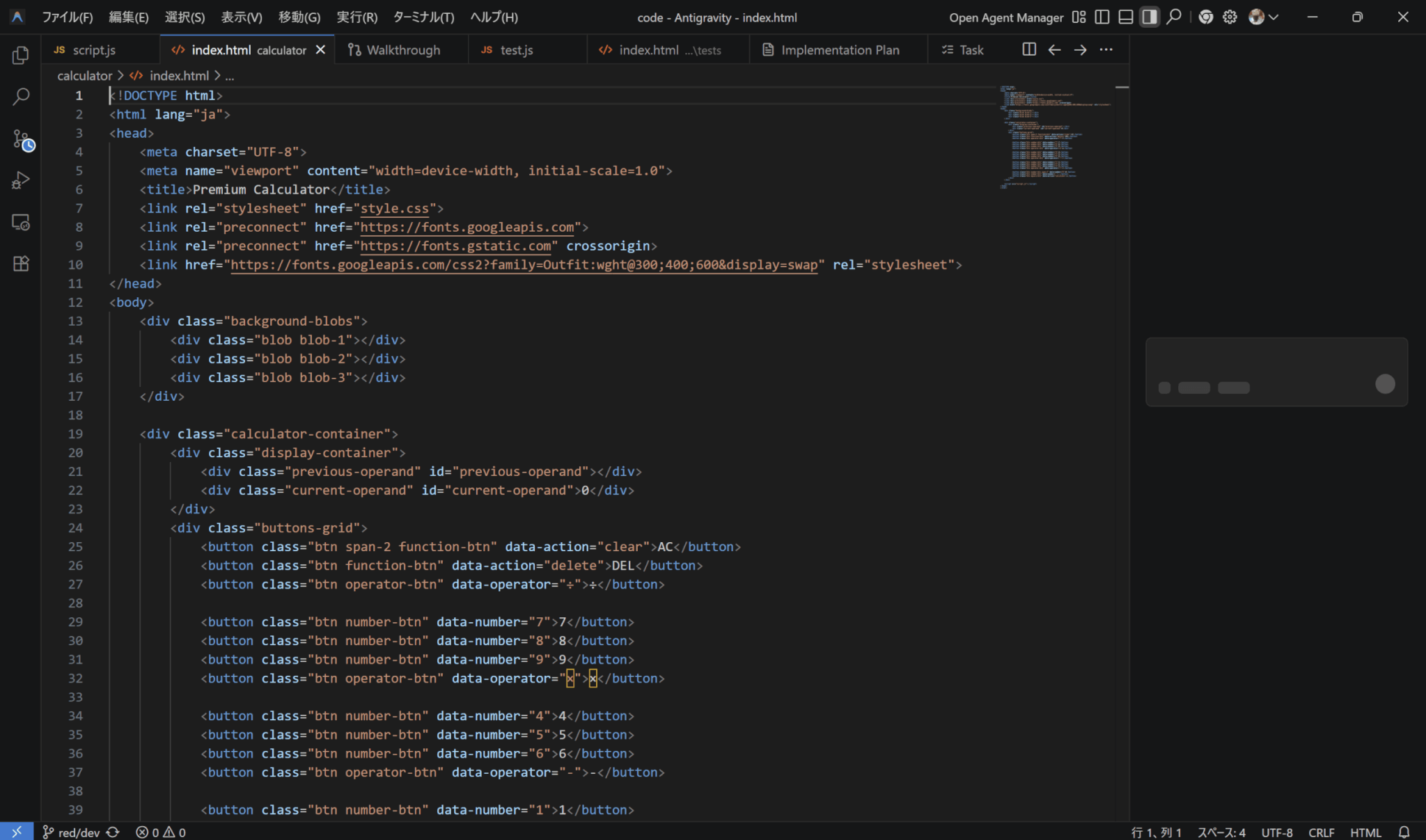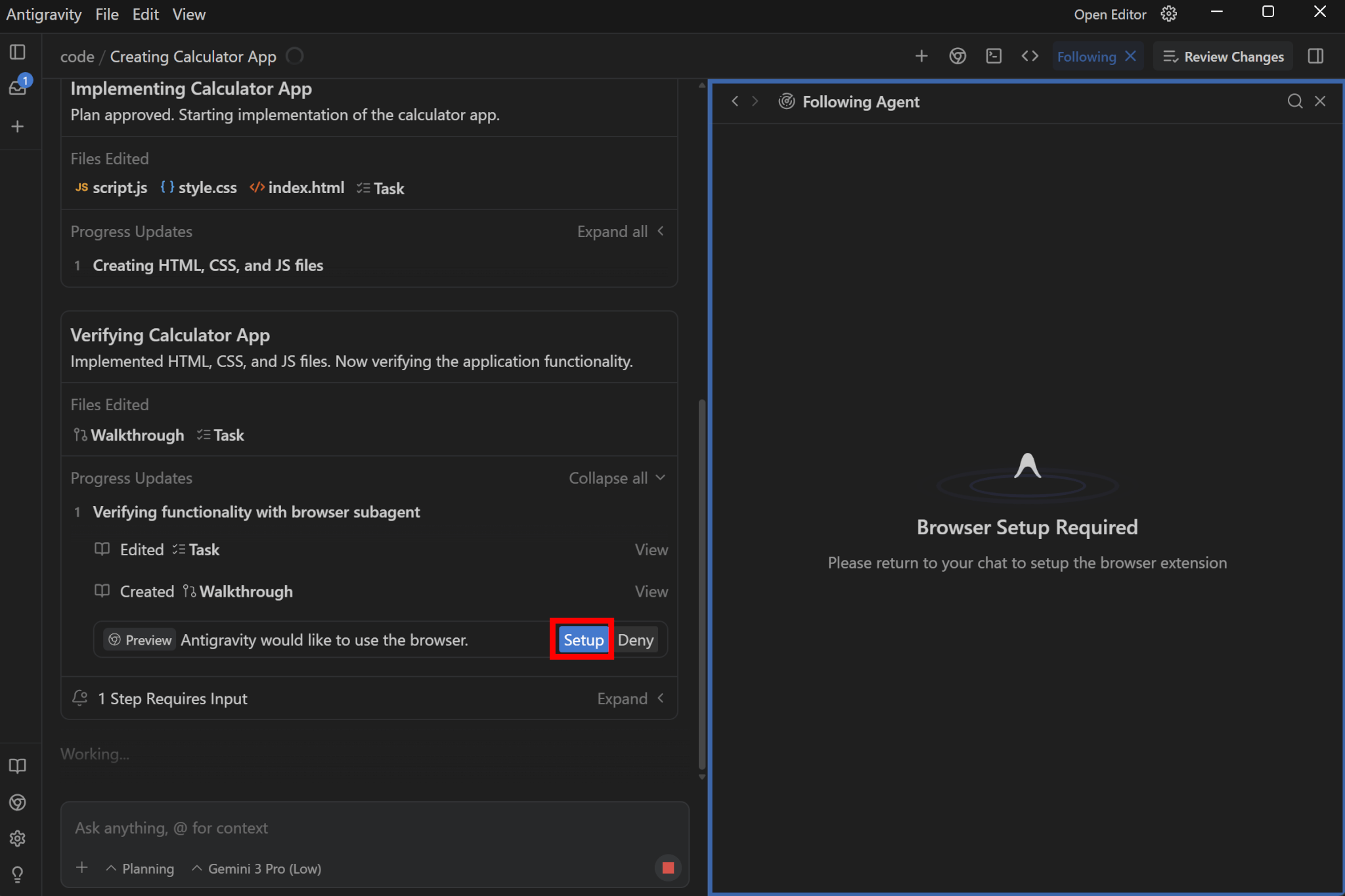今回はPlanningとGemini 3 Pro(Low)を選択し、電卓アプリを作成してもらいました。