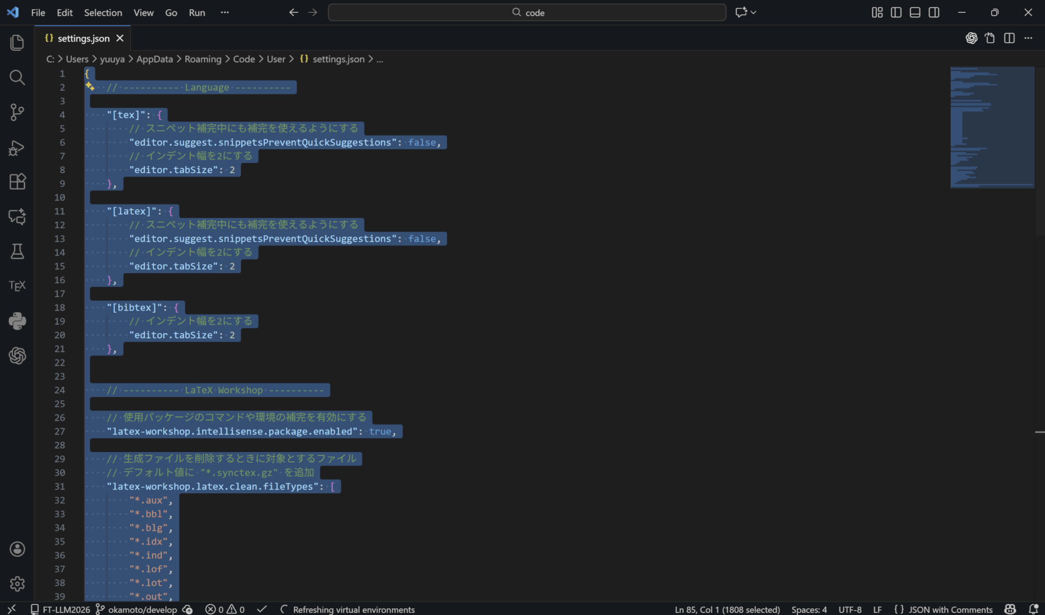 先ほどコピーした内容を貼り付けることで、VS Codeの設定を引き継ぐことができます。