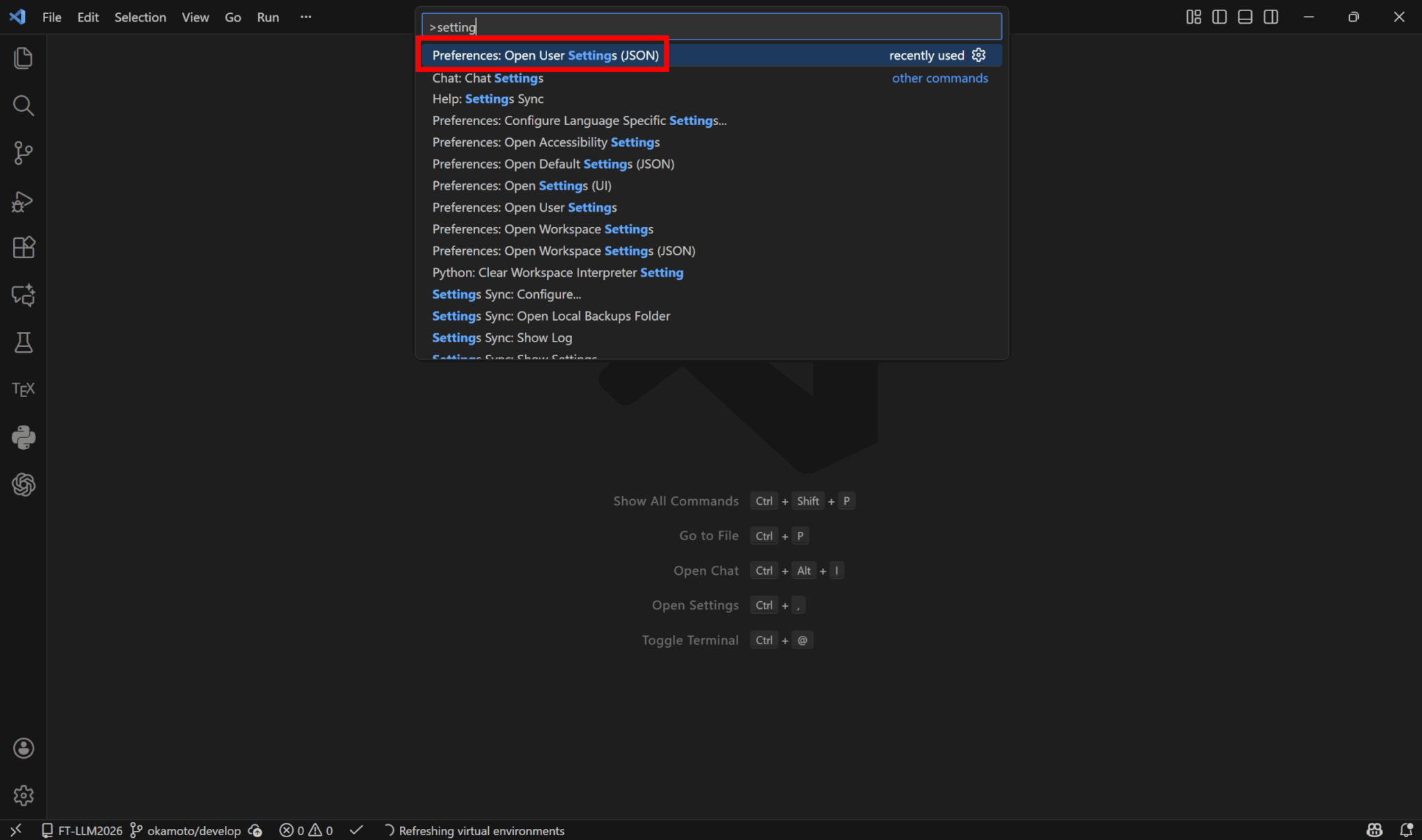VS CodeでCtrl+Shift+Pを押してコマンドパレットを開き、setting.jsonを開きます。ここでは、ユーザー設定を引き継いでいきます。