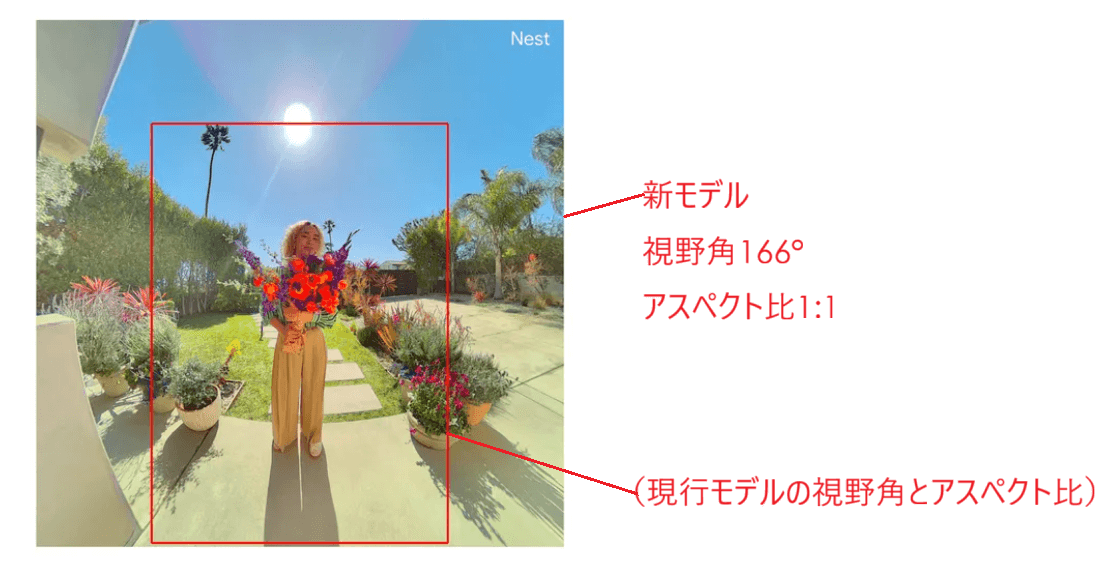さらに、カメラのアスペクト比が従来型と異なり1:1となっており、視野角166°と相まって、広い玄関も完全に見渡すことができます。地面に置かれた荷物や訪問者の様子も、隅々までキャッチ可能です。