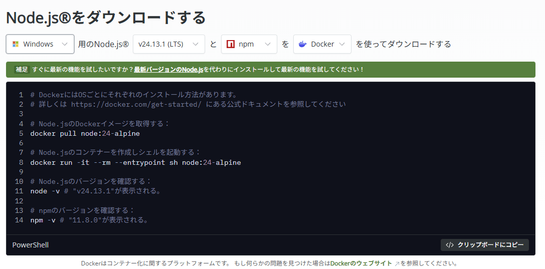 Node.jsは、Codex CLIのインストールに使用するnpm(パッケージ管理ツール)を動作させるために必要なため、ローカル環境にインストールされていない場合はNode.jsをインストールします。