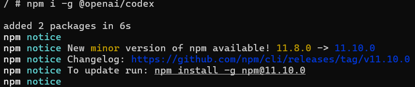 以下のコマンドを実行し、npmを使用してCodex CLIをインストールしてください。