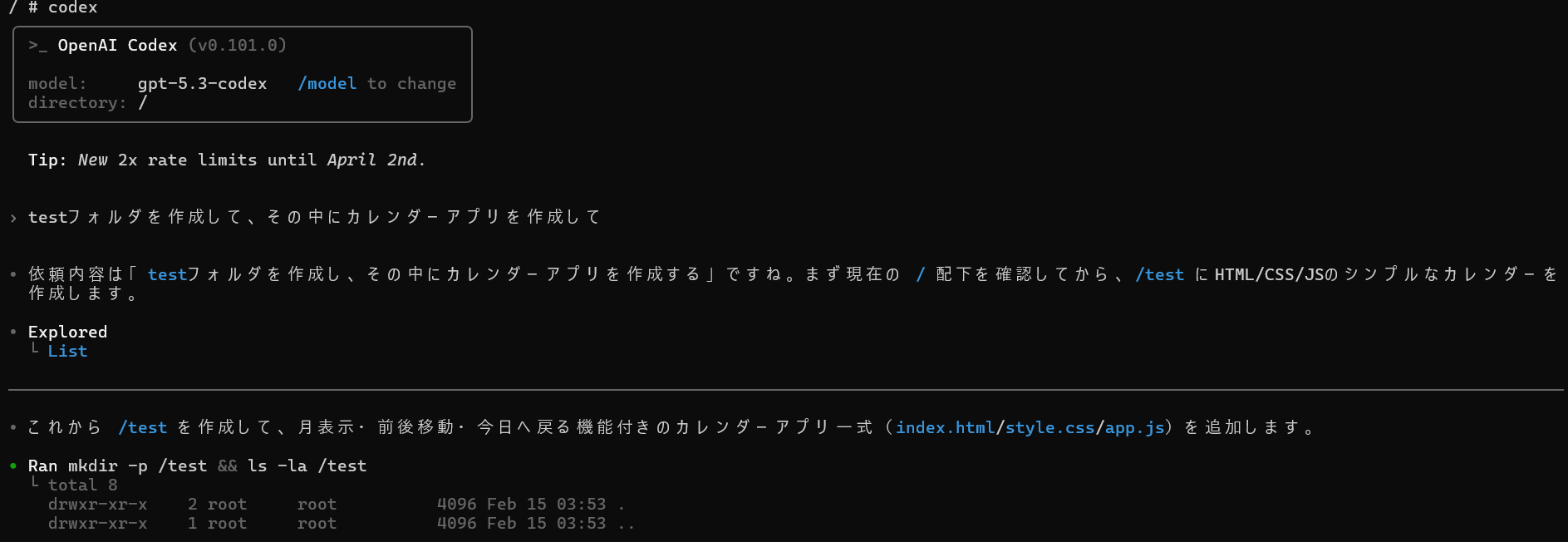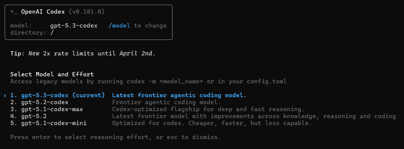 ターミナルで/modelと入力すると、利用するモデルの確認・選択ができます。「gpt-5.3-codex」が選択されていることを確認してください。