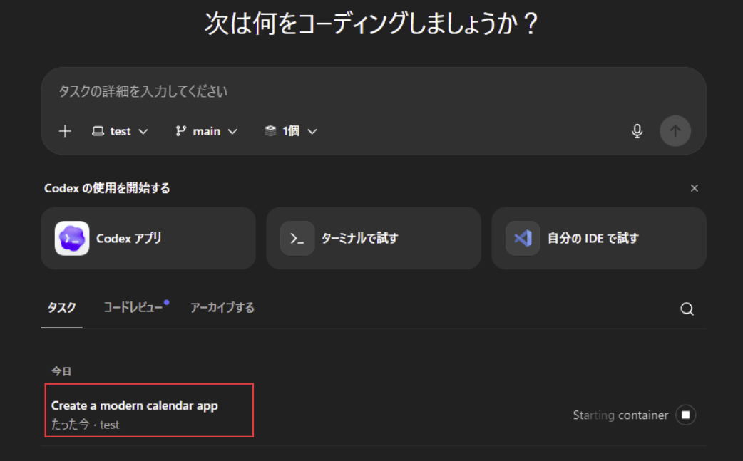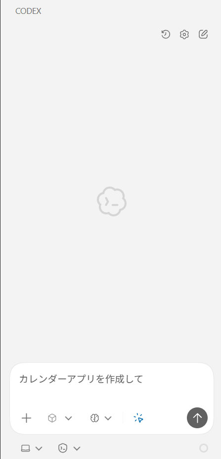 Codexのプロンプト入力欄に指示を入力し、「↑」ボタンをクリックするとタスクが開始されます。今回は「モダンなカレンダーアプリを作成して」と入力しました。