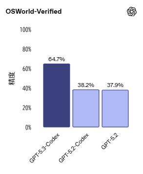 また、デスクトップ環境での操作能力を測るOSWorld-Verifiedでは64.7%の精度が確認され、従来モデル(GPT-5.2-Codex:38.2%、GPT-5.2:37.9%)を大きく上回っています。人間のスコアは約72%と言われており、GUIの操作能力も人間の水準に近づいていることがわかります。