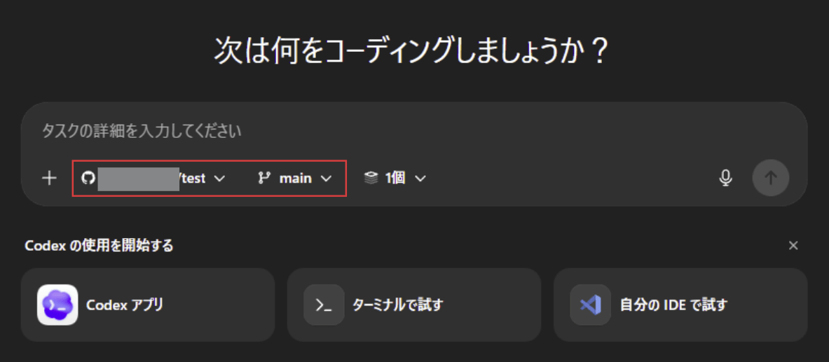 Codexのプロンプト入力欄にGitHubのリポジトリ・ブランチが表示されるので、連携するリポジトリ・ブランチを選択します。