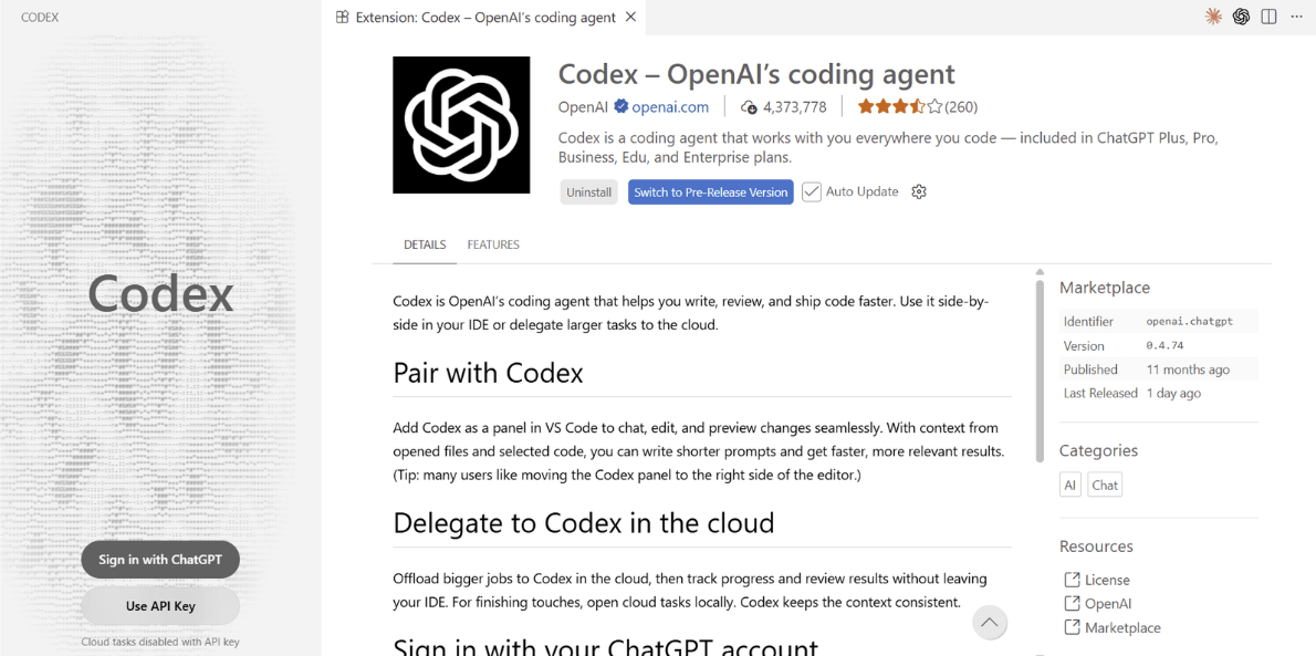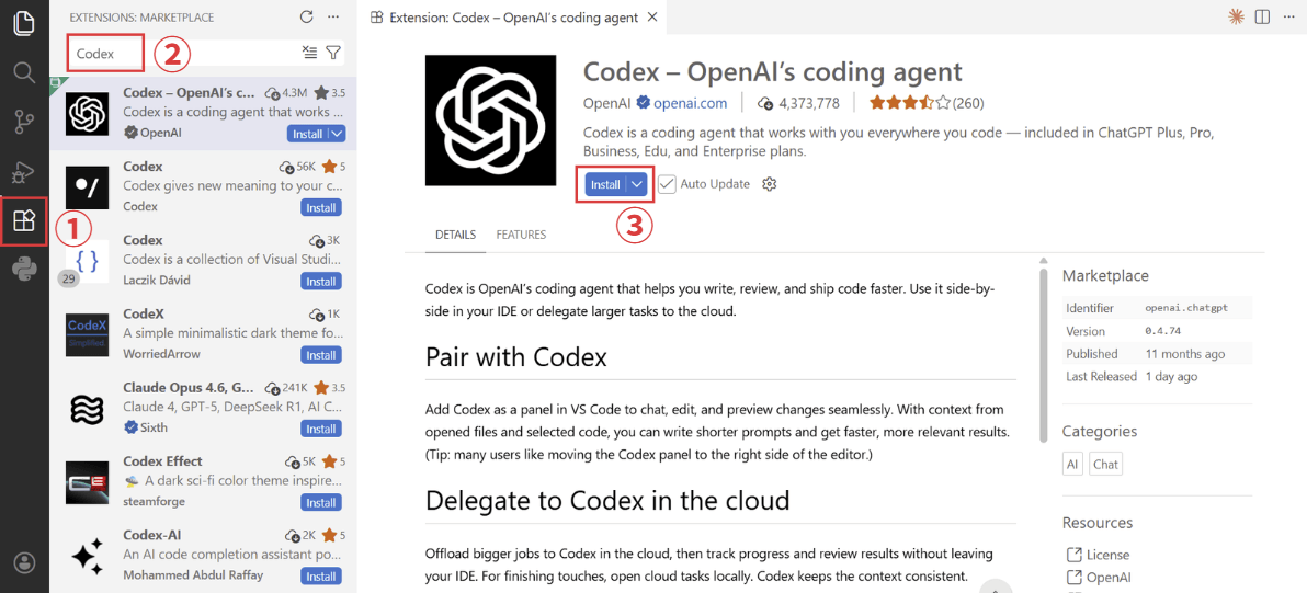 拡張機能のアイコンをクリックし、「codex」で検索して表示される「Codex – OpenAI’s coding agent」をクリックします。画面右側にCodexの説明ページが表示されるので、「Install」ボタンをクリックしてインストールを行います。