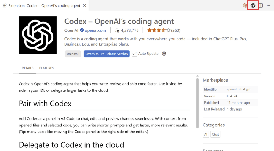 インストールが完了すると、VS Codeの画面右上にOpenAIのアイコンが表示されるので、クリックしてCodexのインターフェースを起動します。