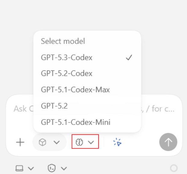 プロンプト入力欄左下のアイコンをクリックすると、利用するモデルが確認・選択できます。「GPT-5.3-Codex」が選択されていることを確認してください。