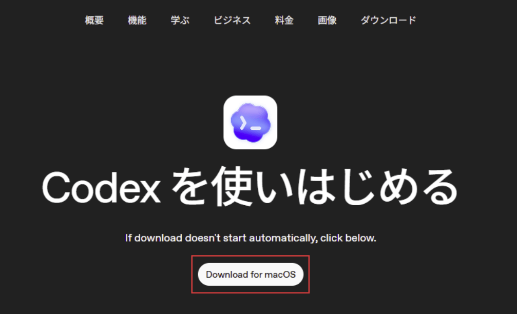 https://chatgpt.com/ja-JP/codex/get-started にアクセスし、「Download for macOS」ボタンをクリックします。