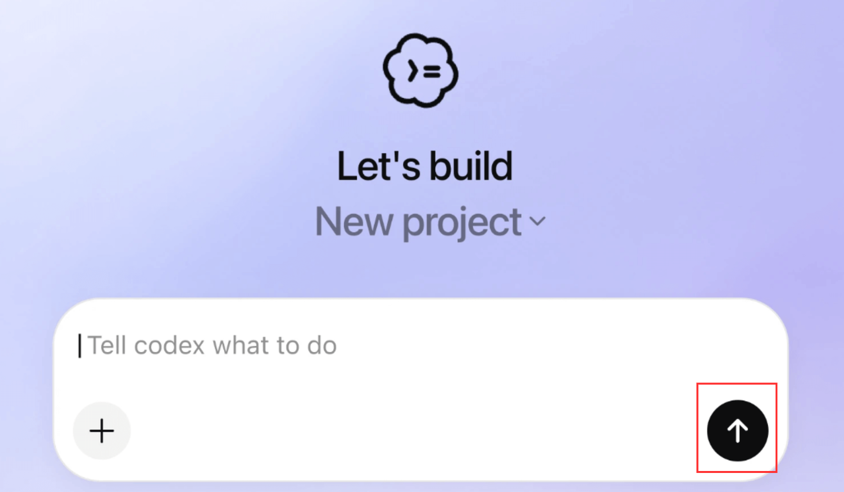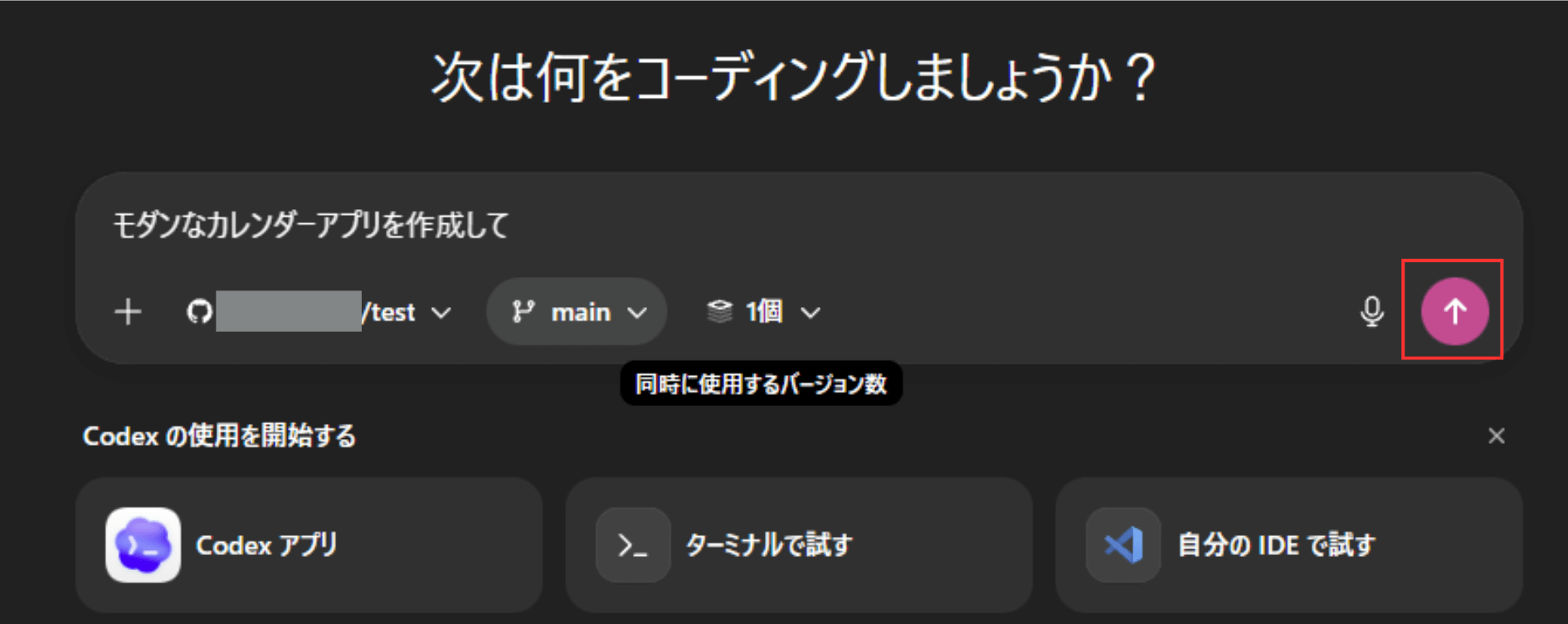 Codexアプリのプロンプト入力欄にプロンプトを入力し、「↑」ボタンをクリックすることでタスクが開始されます。