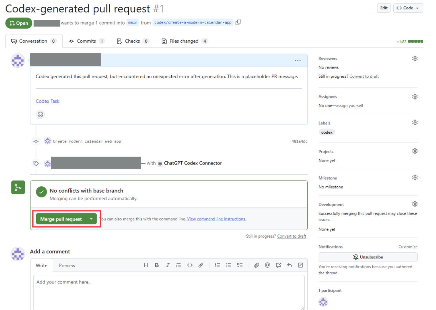 「Merge pull request」ボタンをクリックし、作成したプルリクエストをマージすることでリポジトリに変更が反映されます。