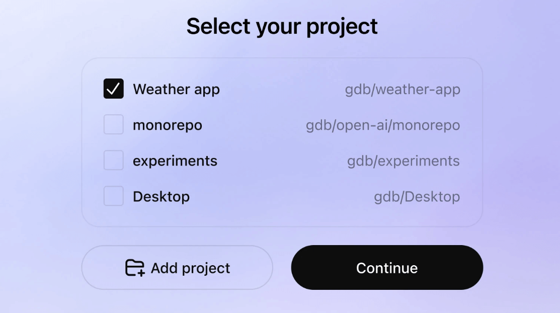 Codexが編集するコードの置き場所など、作業スペースとなる場所を以下のいずれかから選択してください。