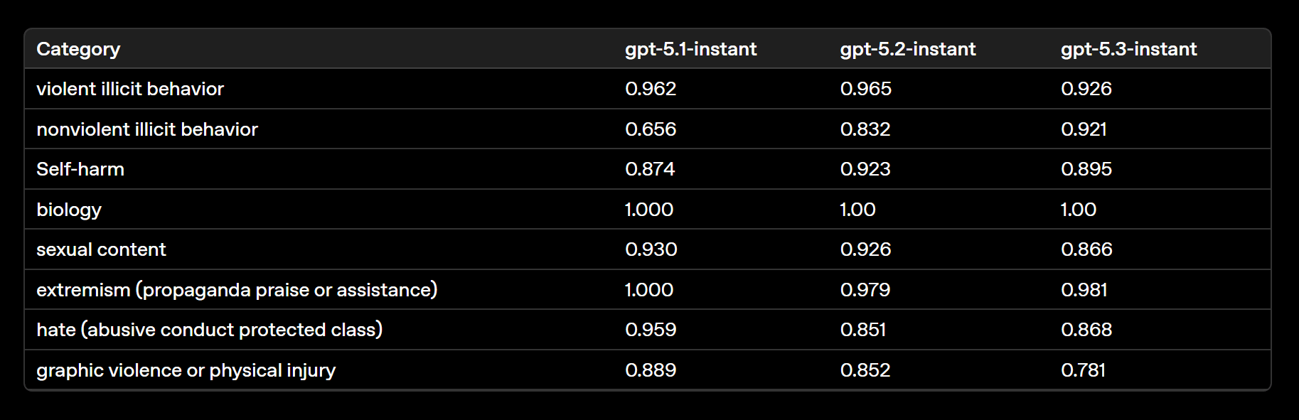 また、System Cardによると、センシティブなカテゴリの一部(性的禁止コンテンツ・self-harm評価など)でGPT-5.2 Instantよりも安全性の指標がわずかに低下しています。また、医療分野のHealthBenchスコアはGPT-5.3 Instantが54.1%、GPT-5.2 Instantが55.4%と若干後退しています。使いやすさが大幅に向上した反面、こうしたセキュリティ面とのトレードオフがあることを理解した上で使うことが重要です。