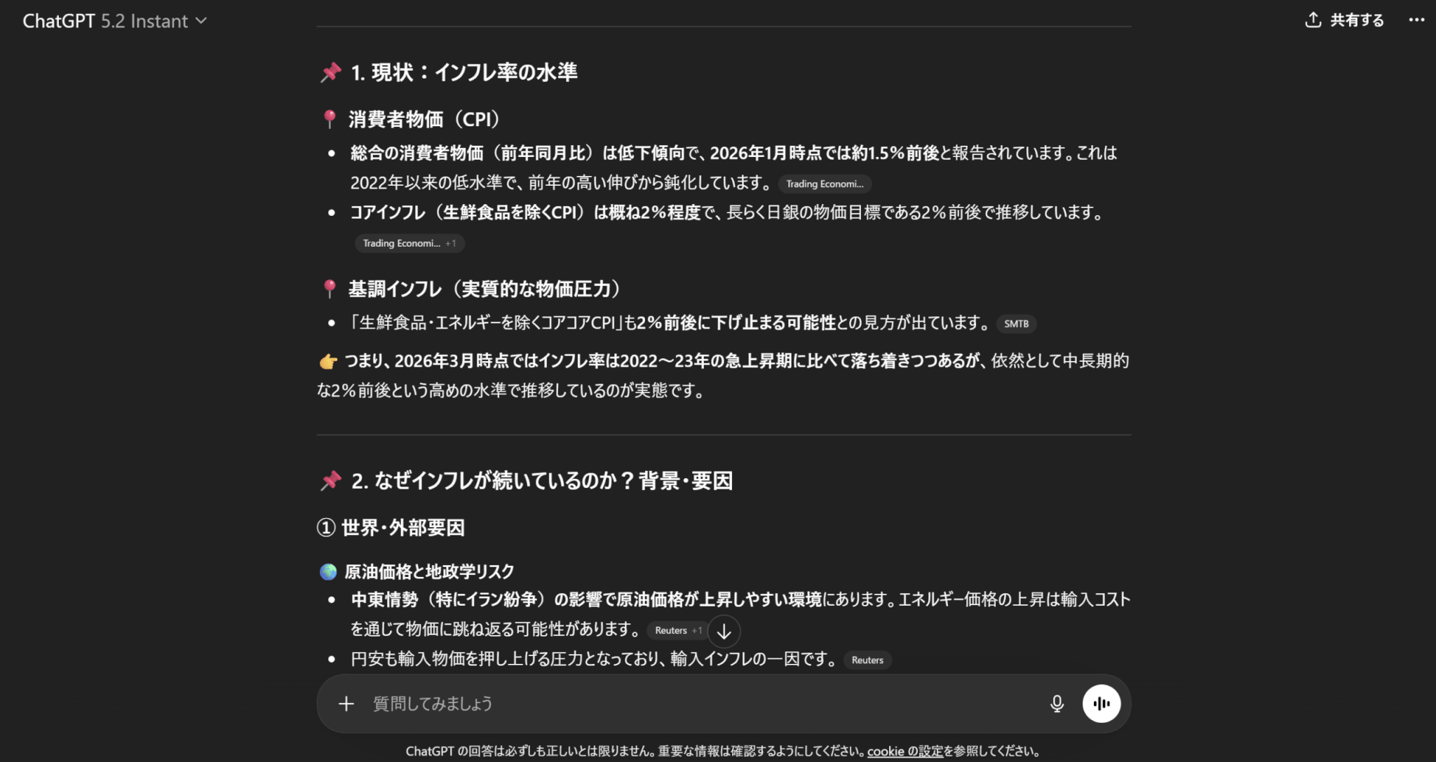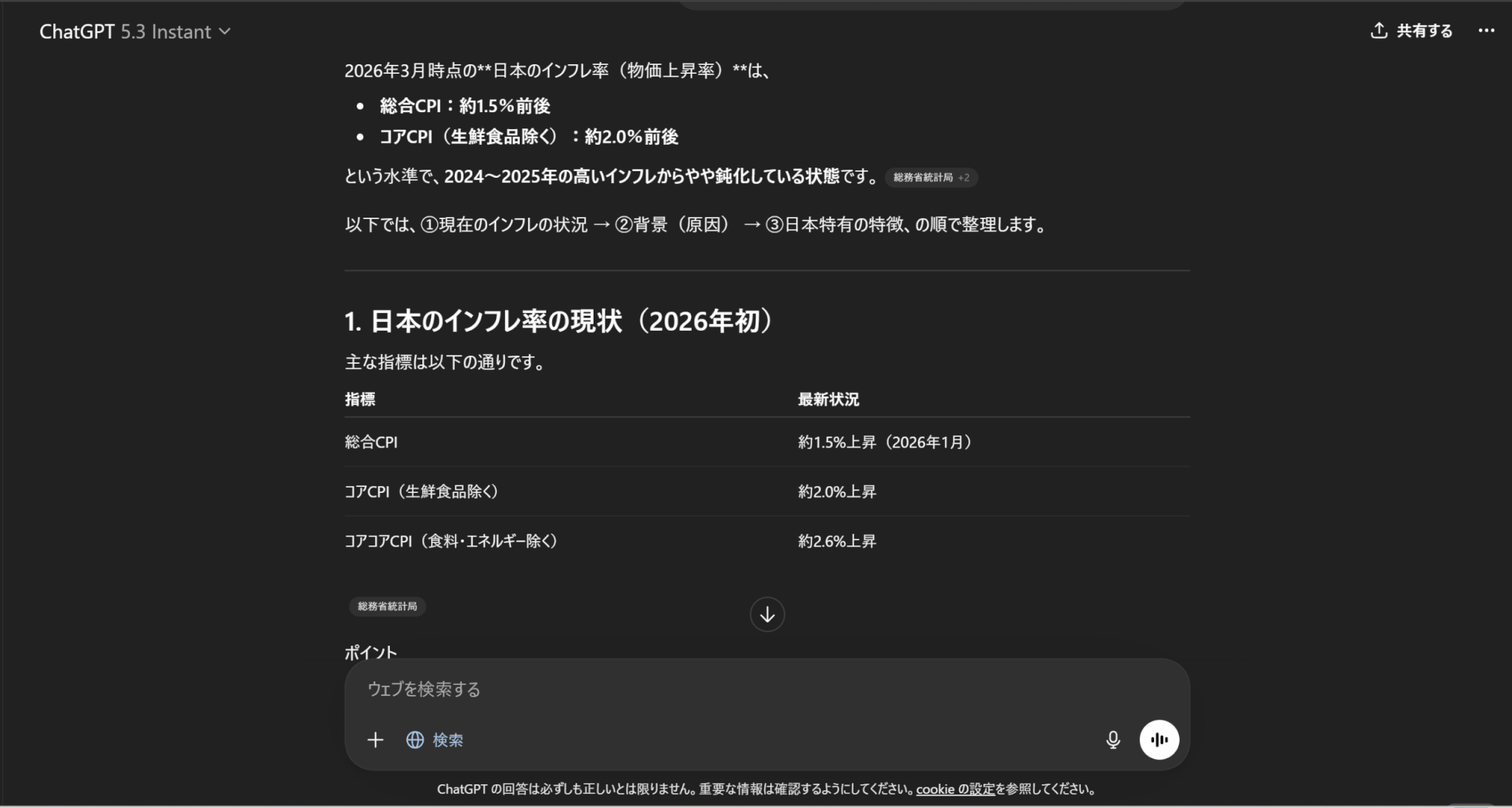 以下は、Web検索機能をオンにして、「2026年3月時点での日本のインフレ率の現状と背景を教えてください。」というプロンプトを送信したときの結果比較です。