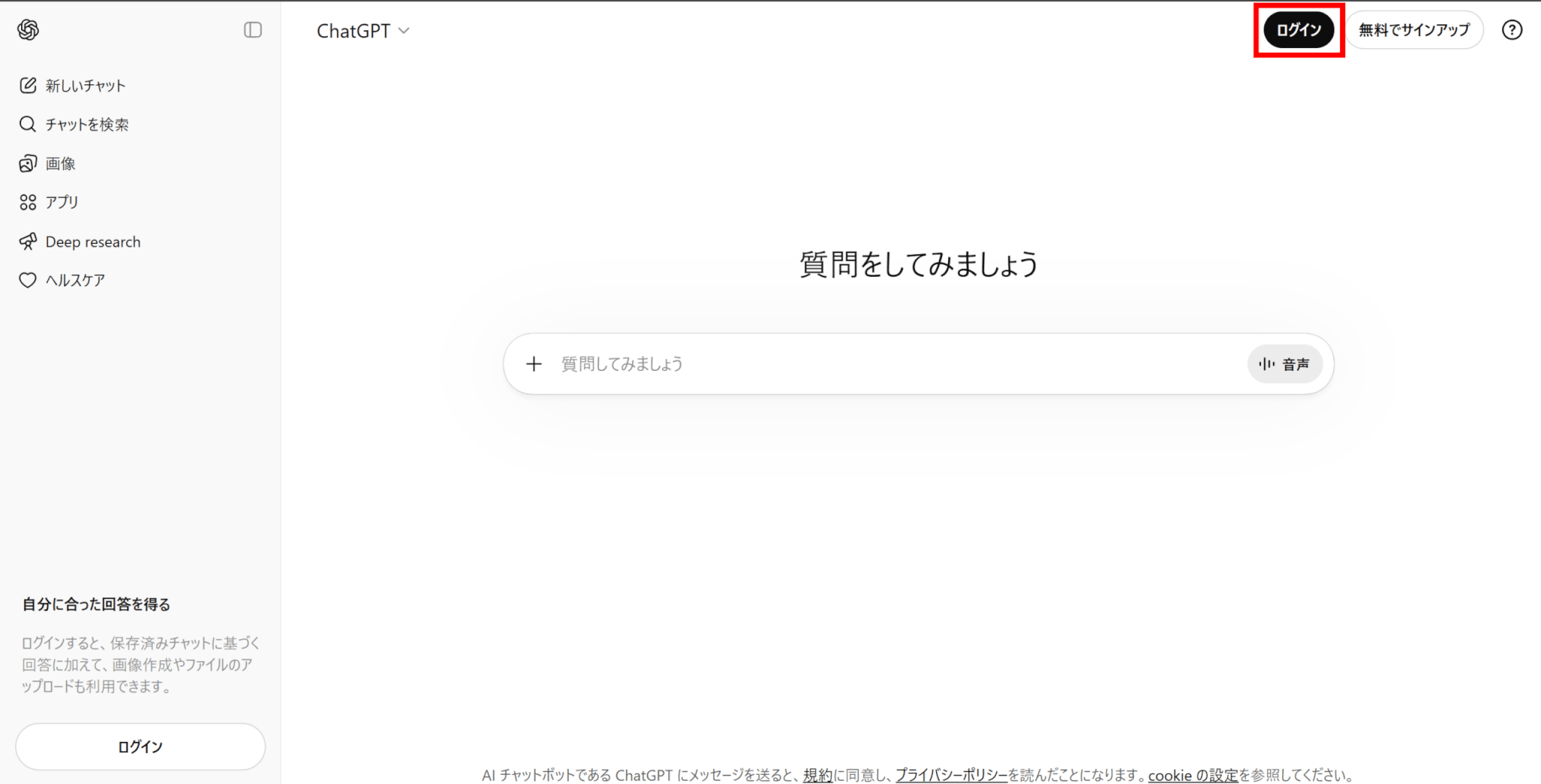 ブラウザでChatGPTを開きます。画面右上の「ログイン」をクリックして、ChatGPTのアカウントでログインしましょう。
