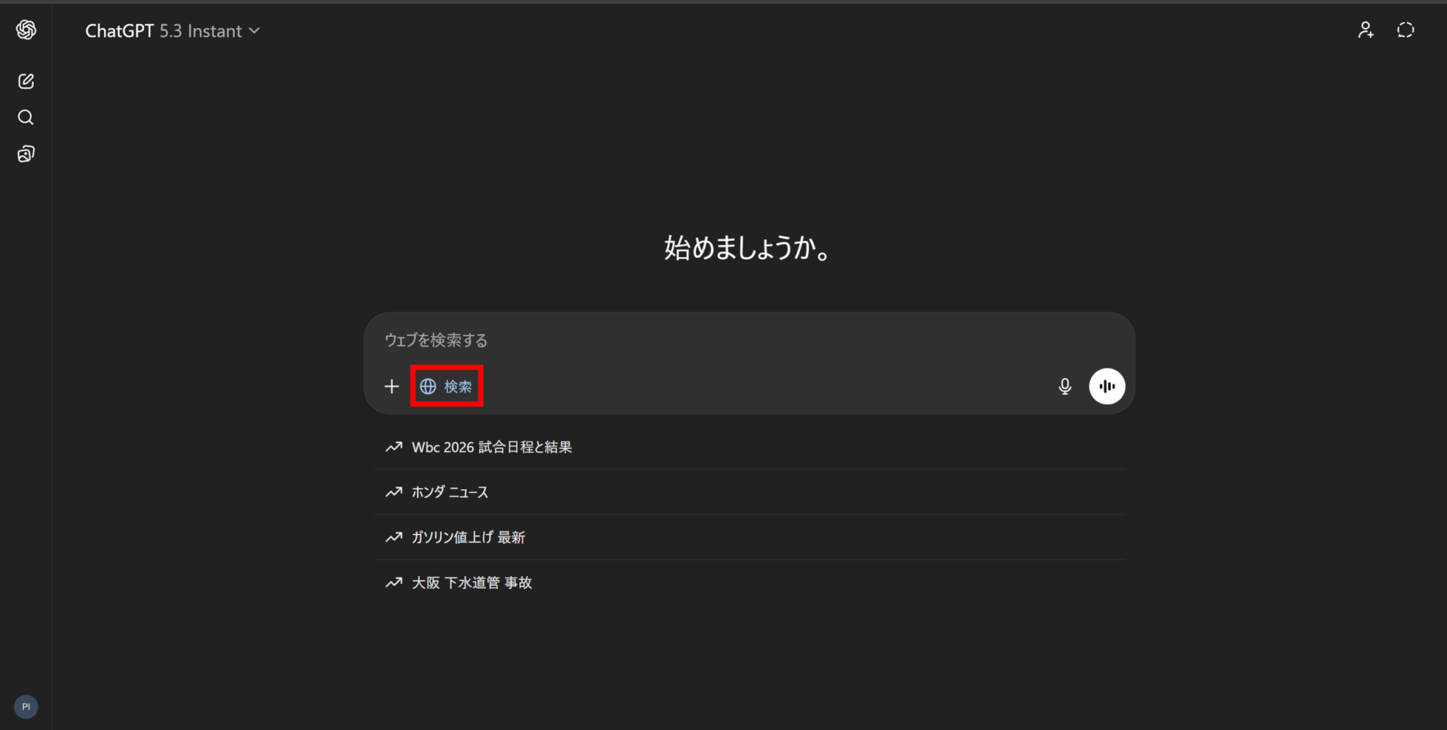 メッセージウィンドウに「検索」と表示されていれば、回答生成時にWeb検索が使用されます。