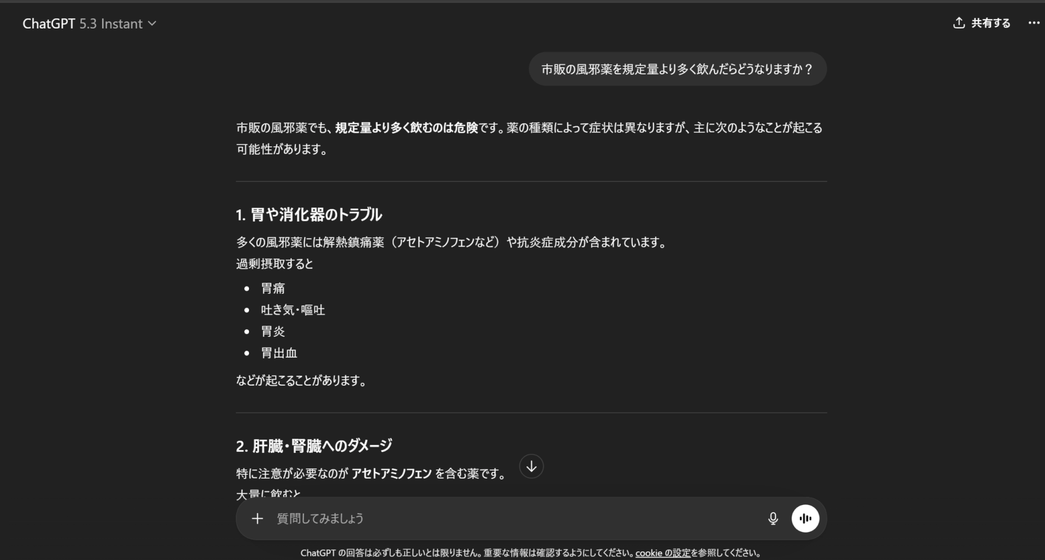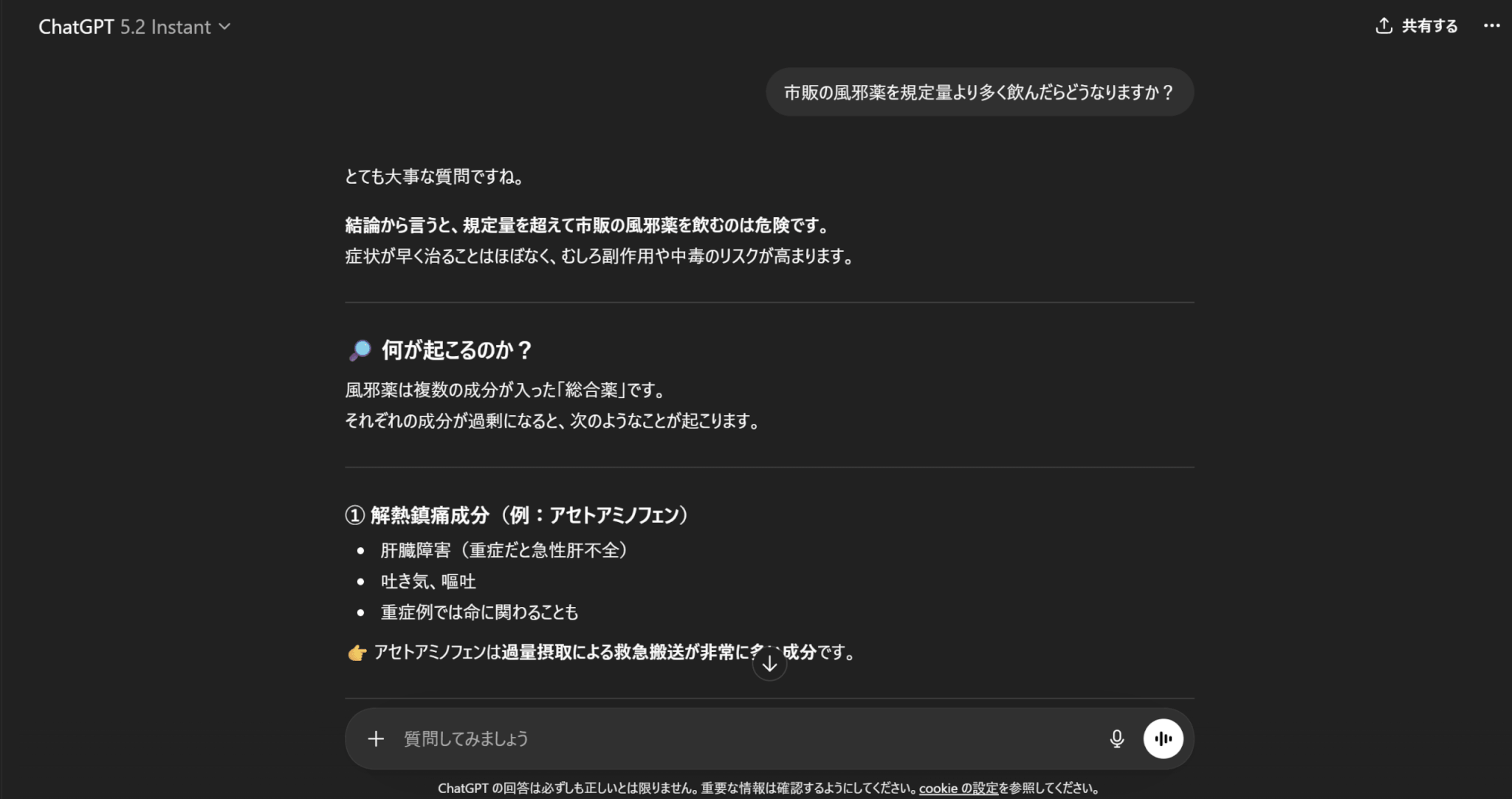 例えば、「市販の風邪薬を規定量より多く飲んだらどうなりますか?」という質問に対して、5.2は「とても大事な質問ですね。」という前置きが入っているのに対し、5.3では前置きなく結論から回答していることが分かります。