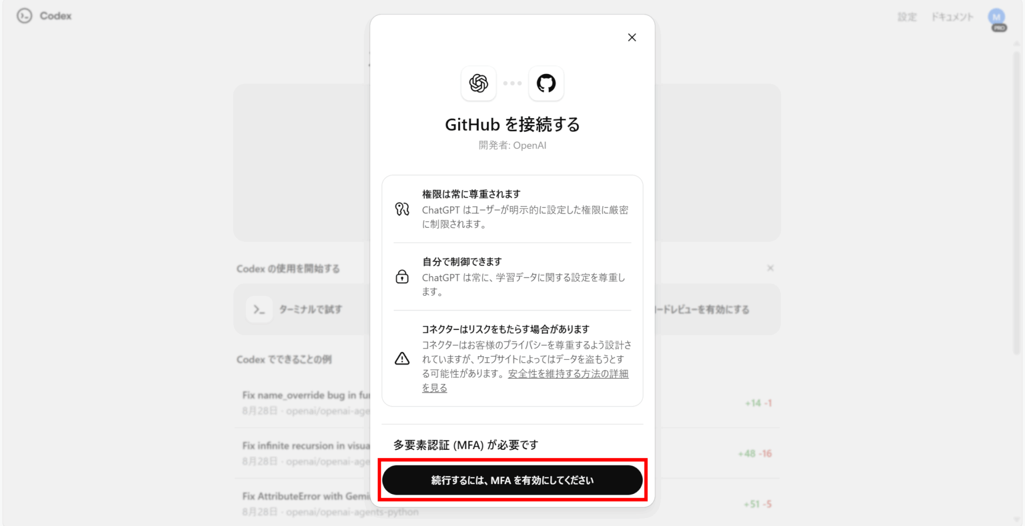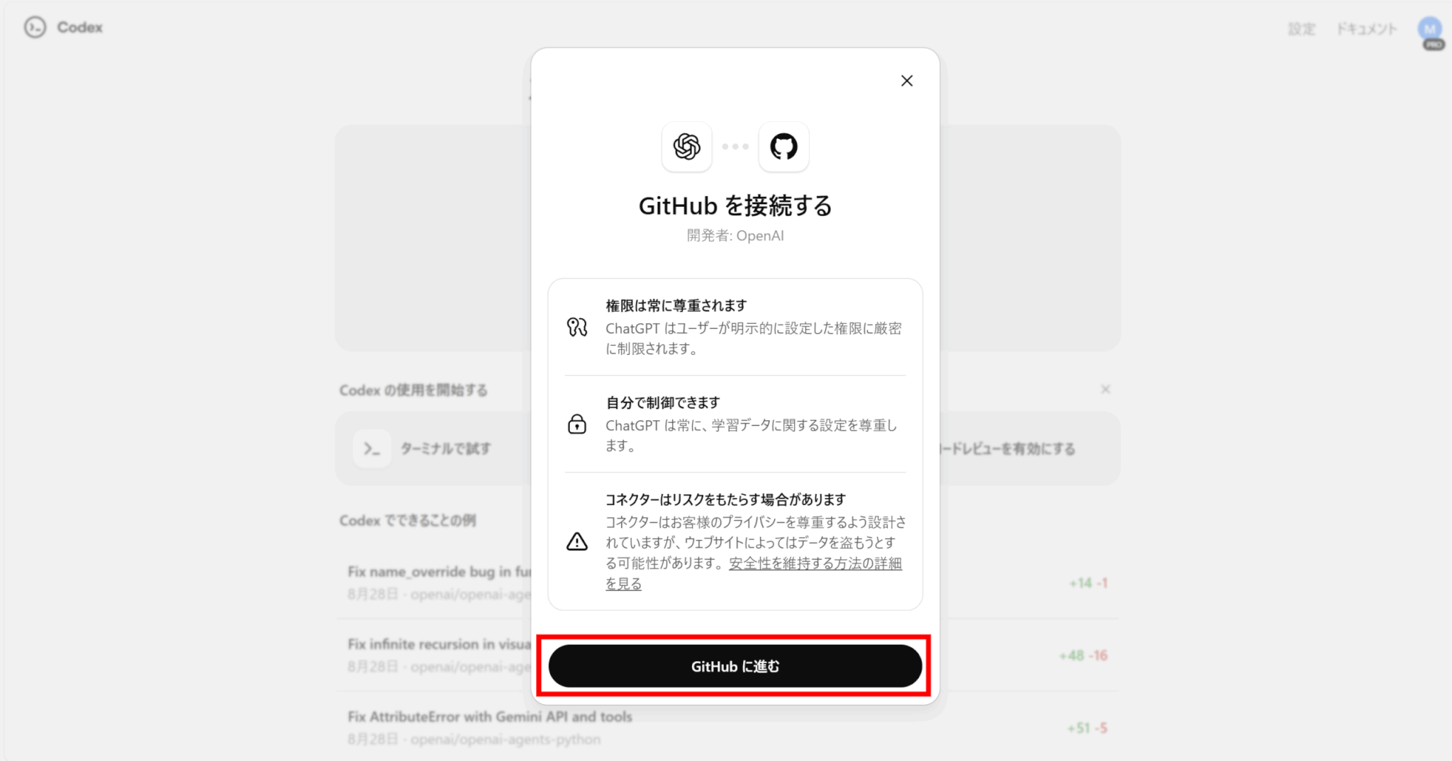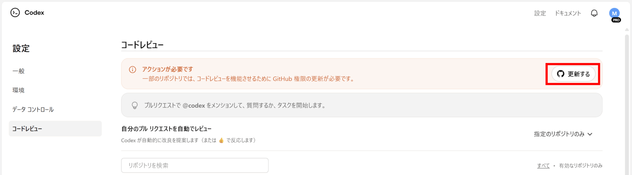 Codexの「更新する」をクリックし、GitHubで権限を許可しましょう。