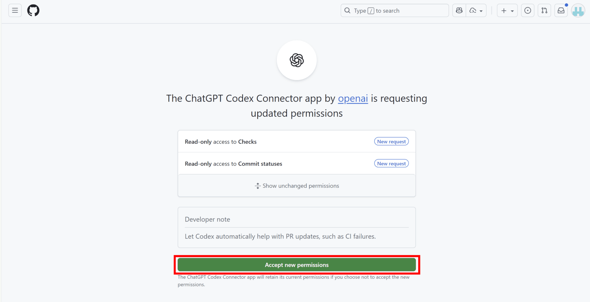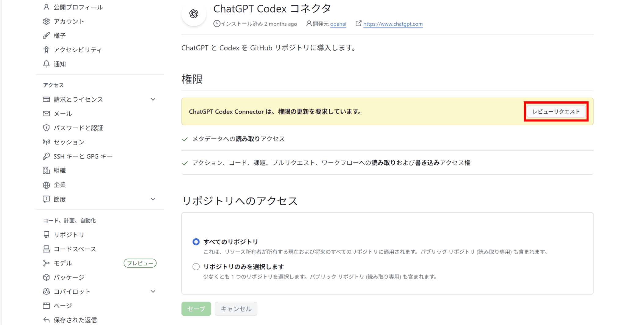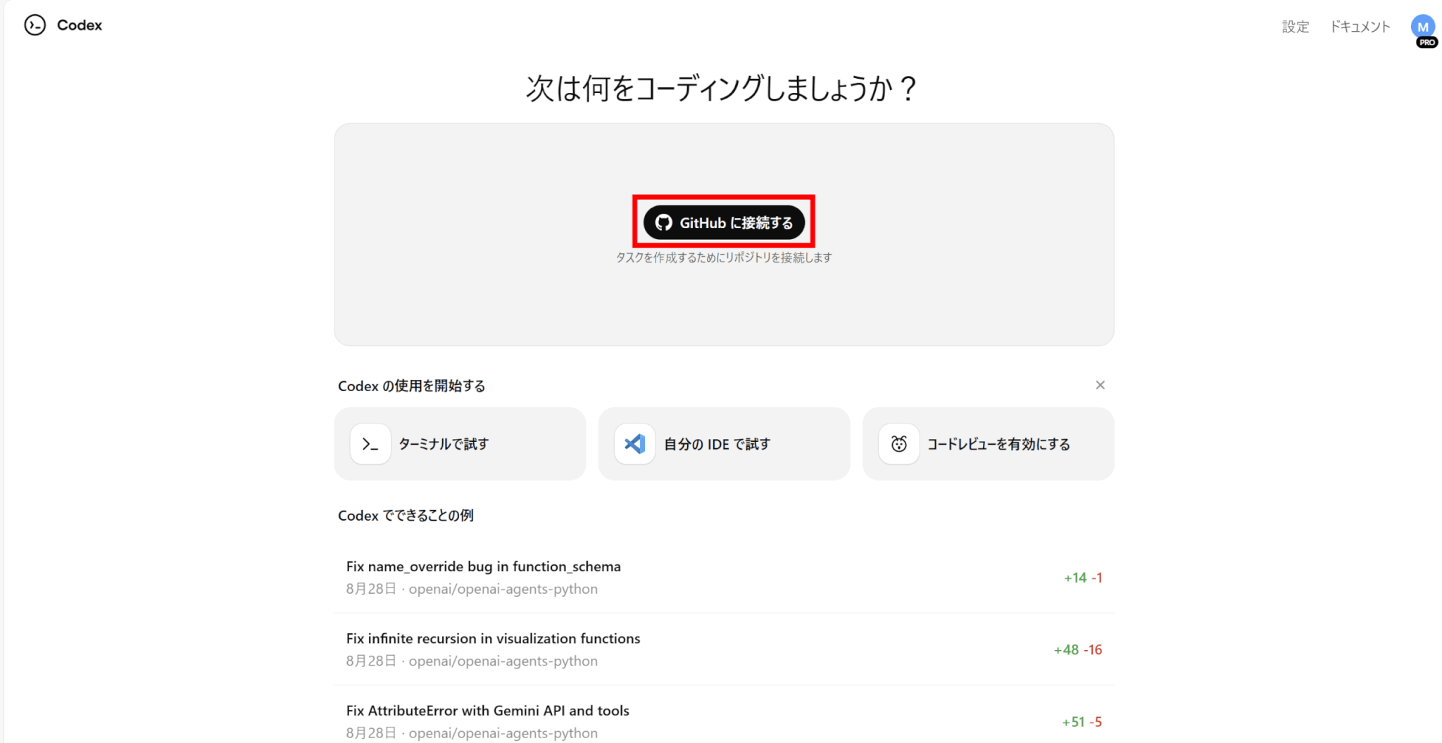Codexの「更新する」をクリックし、GitHubで権限を許可しましょう。