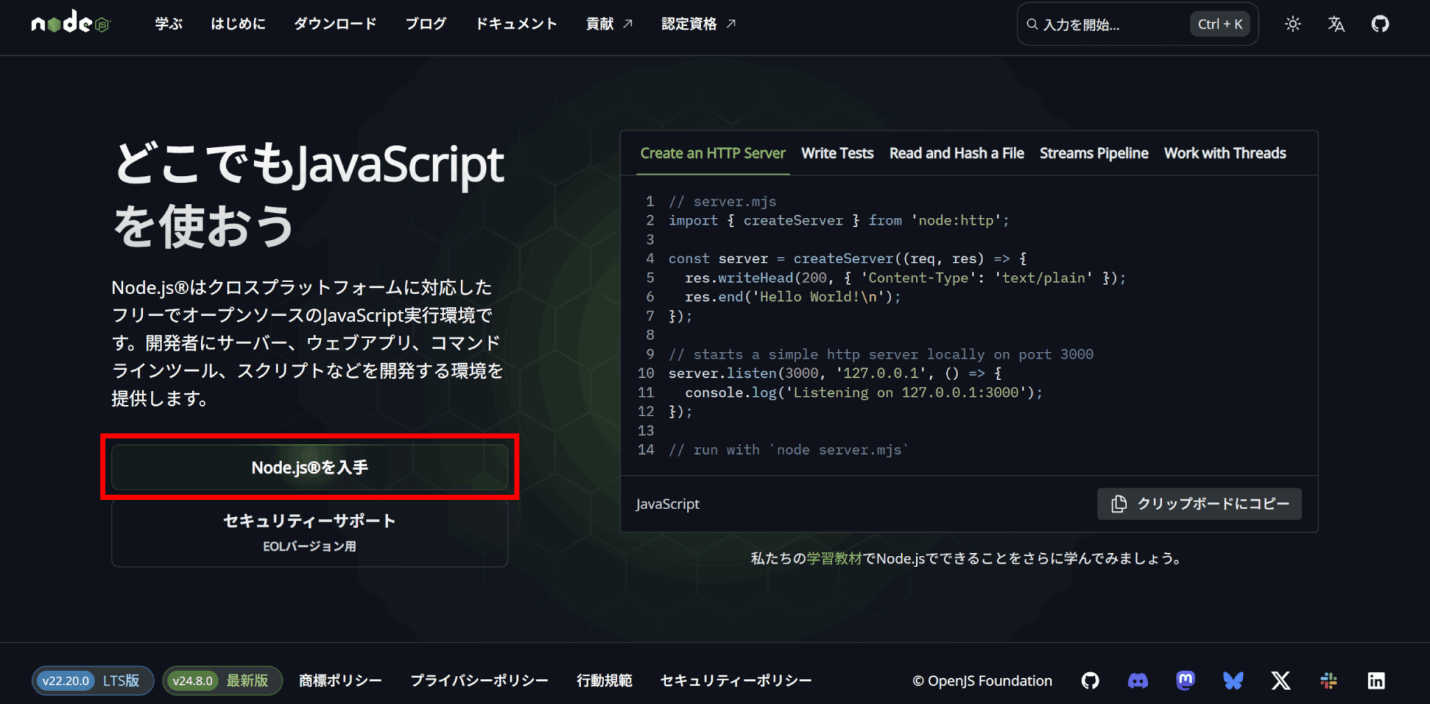 公式サイトにアクセスし、「Node.jsを入手」をクリックしてインストーラをダウンロードしましょう。