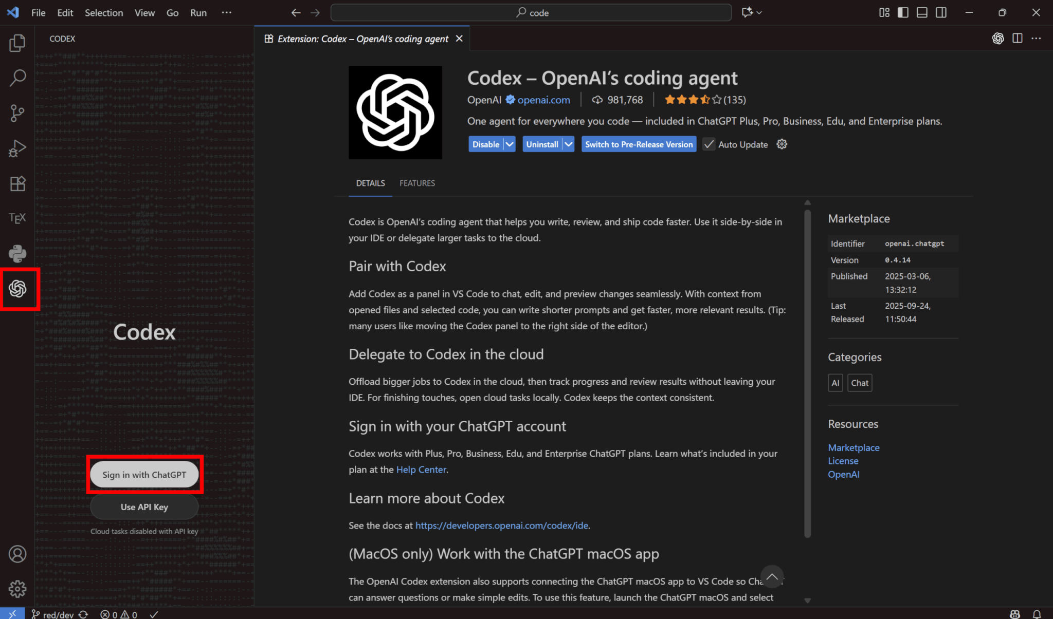 左のタブからCodexの拡張機能を開き、「Sign in with ChatGPT」をクリックします。
