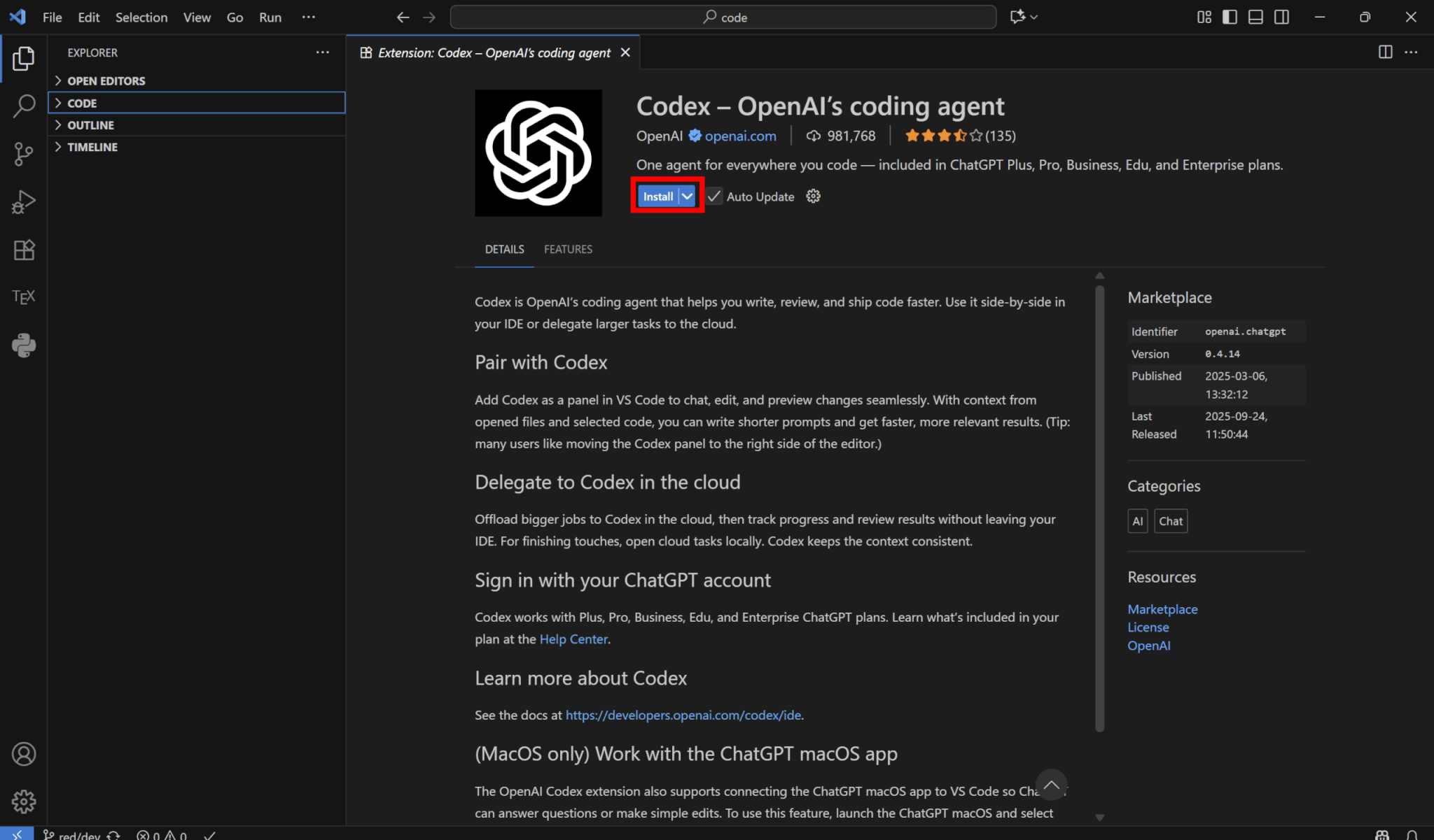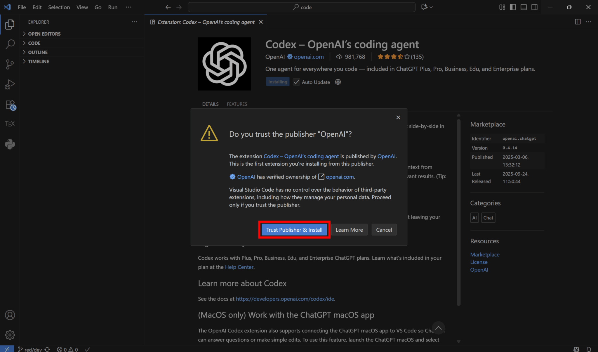 なお、VS CodeでOpenAIの拡張機能を初めてインストールする場合は提供元を信用するかどうかの警告が出るため、「Trust Publisher &Install」をクリックしてください。