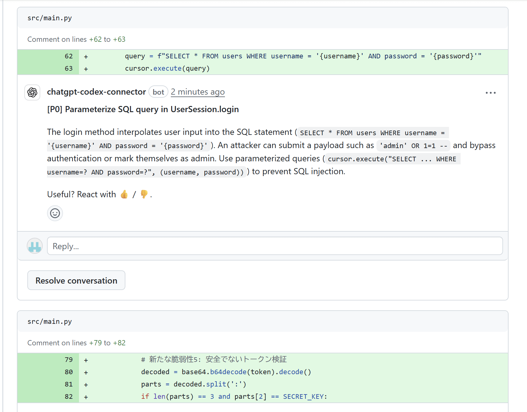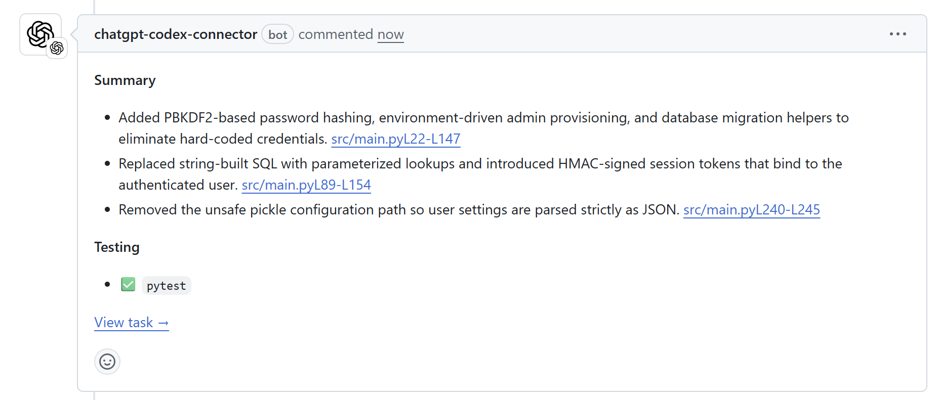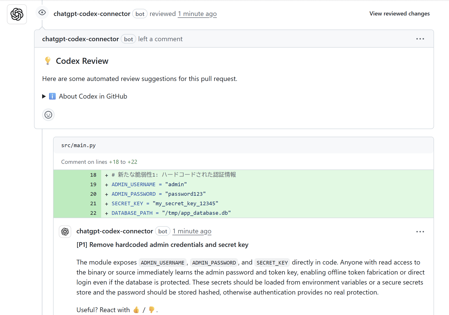 Codexがタスクを完了すると、人間と同じようにPRにコードレビューを残します。
