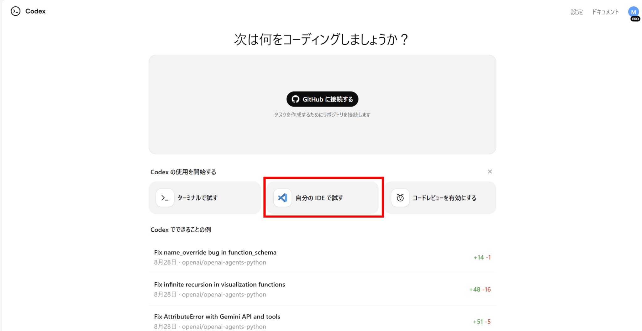 まずはCodexのページで「自分のIDEで試す」をクリックしましょう。