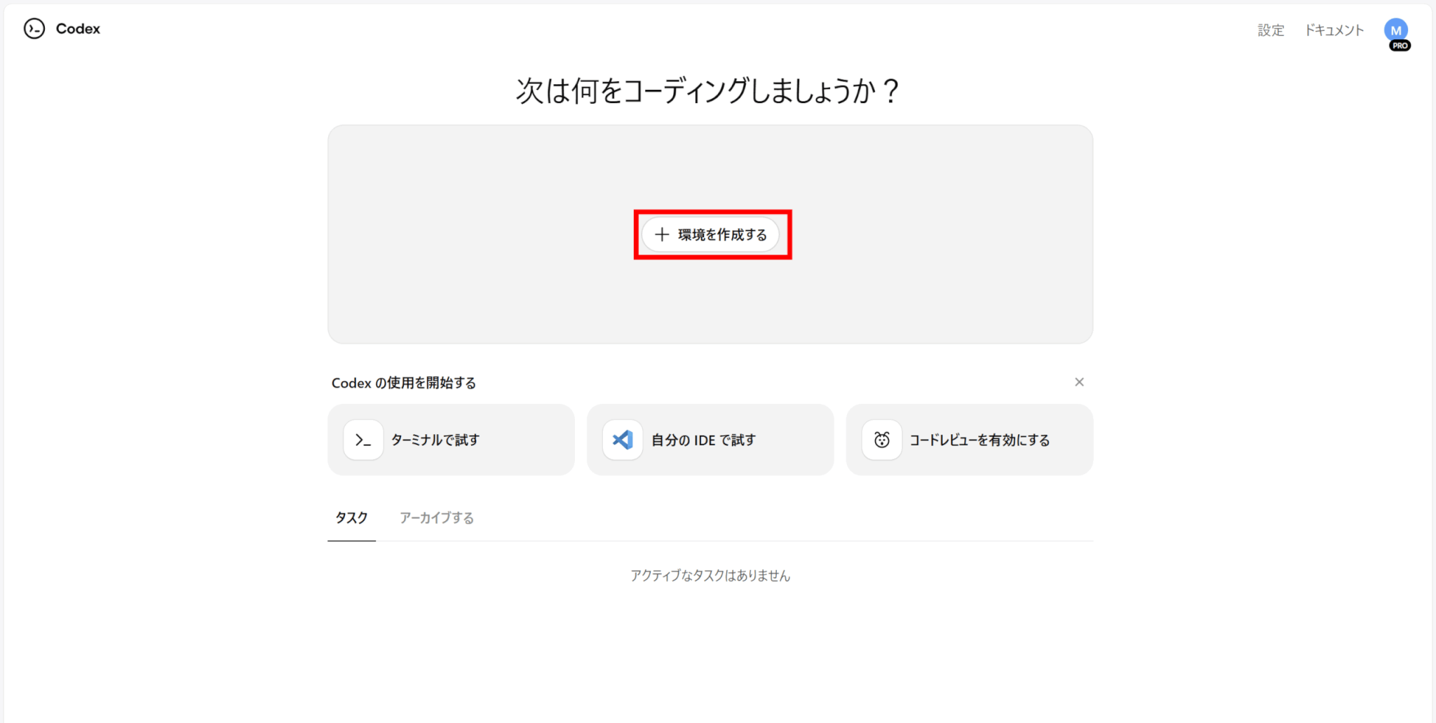 ログイン後、左側にある「Codex」をクリックします。