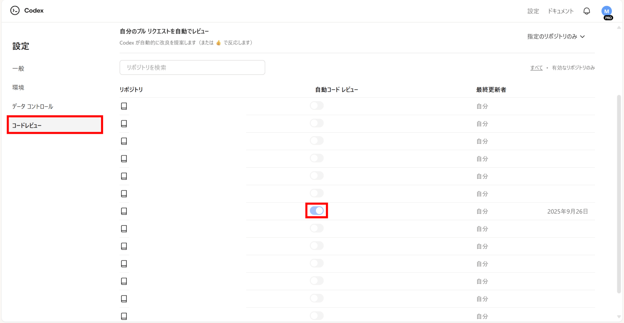 まずはCodexの設定に移動し、リポジトリでコードレビューを有効にします。