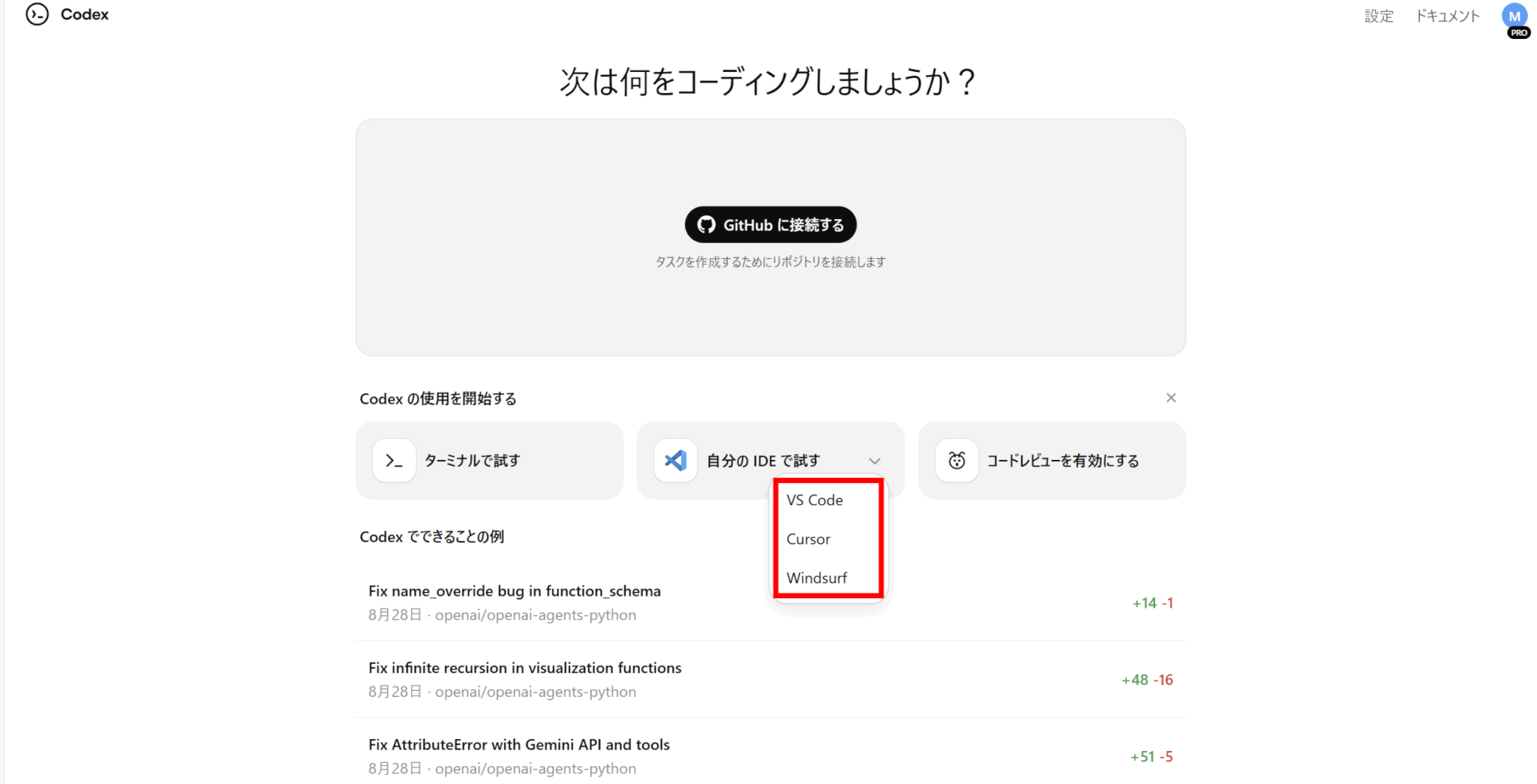 CodexはVS Code、Cursor、Windsurfで利用可能です。