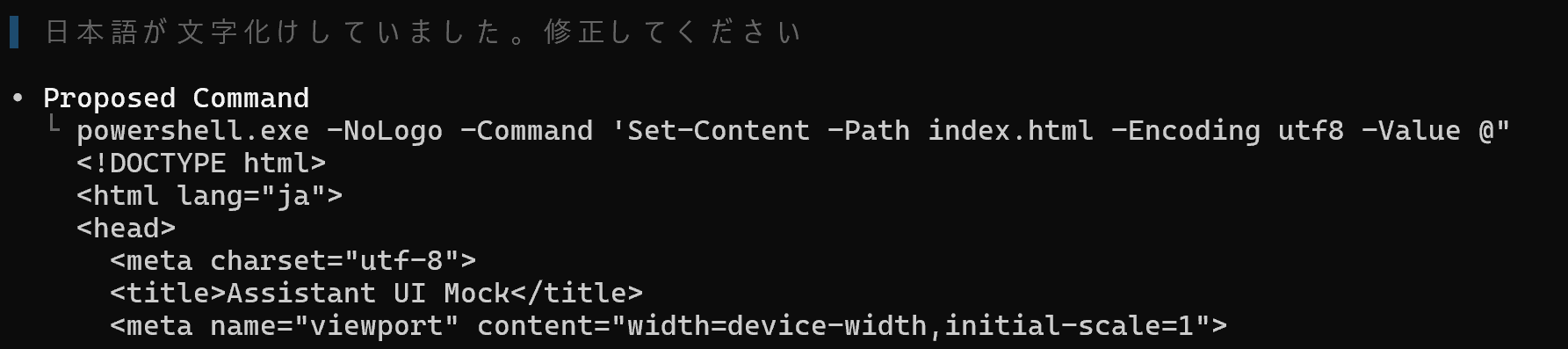 今回は日本語が文字化けしていたので、修正するように指示を出しました。
