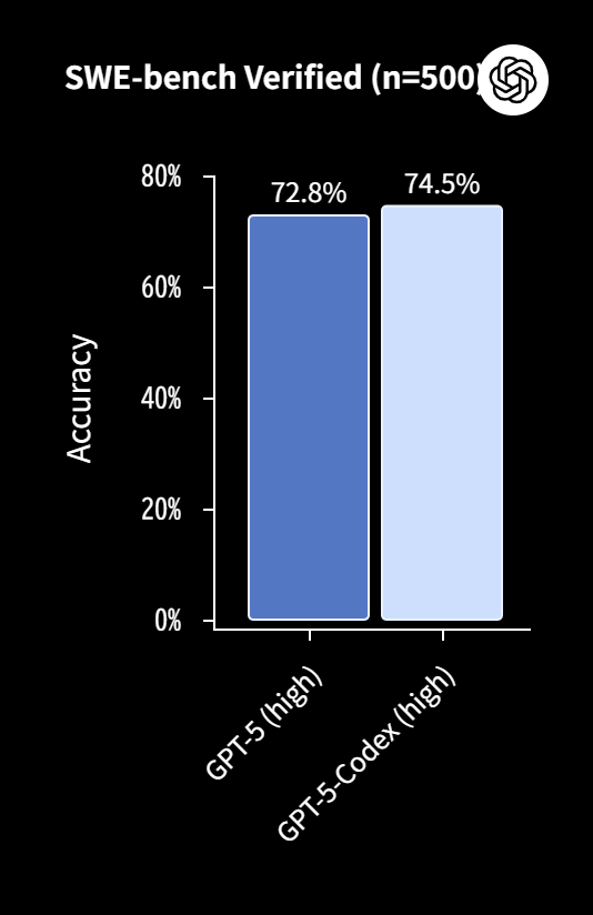 GPT-5-Codexは、ソフトウェア開発における実世界の問題解決能力を測るSWE-benchにおいて、74.5%という高い成功率を記録し、ベースモデルであるGPT-5さえも上回る性能を示しました。
