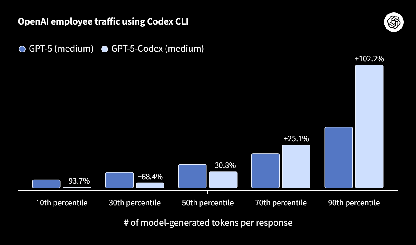 OpenAI従業員のCodex CLI利用状況では、軽量なタスクではGPT-5-CodexはGPT-5よりも93.7%少ないトークン使用となり、重いタスクでは約2倍となっています。