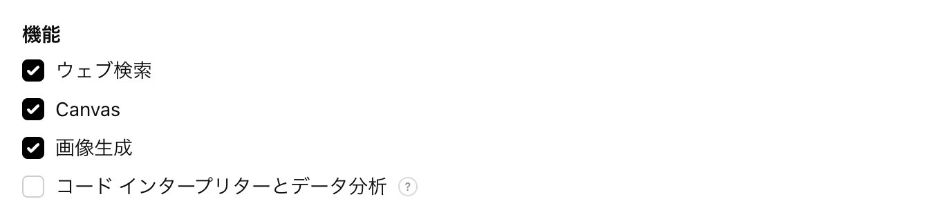 ウェブ検索、Canvas、画像生成、コードインタープリターとデータ分析の機能を有効にすることができます。