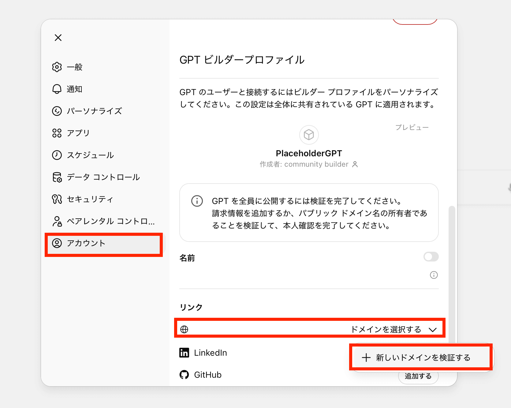 「アカウント」からGPTビルダープロファイルを表示させ、リンクの「ドメインを選択する」から「新しいドメインを検証する」をクリックします。