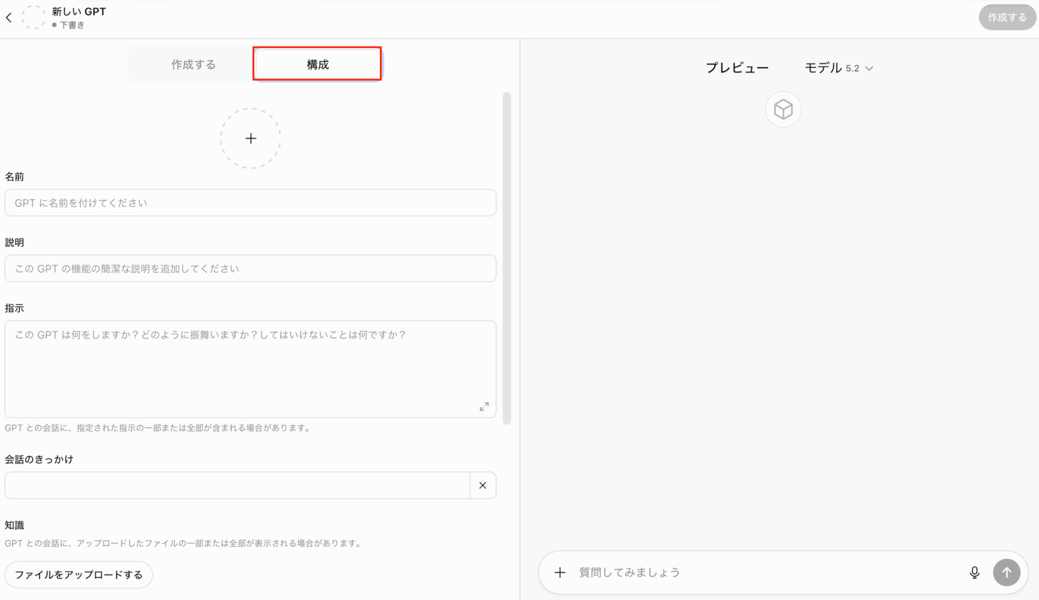 「GPTを作成する」から「構成」タブを選択します。