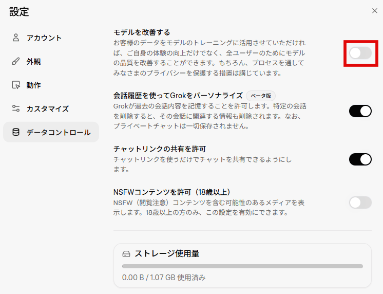 入力した内容がモデル改善に使用されないようにする設定は、「設定」→「データコントロール」→「モデルを改善する」をオフでできます。