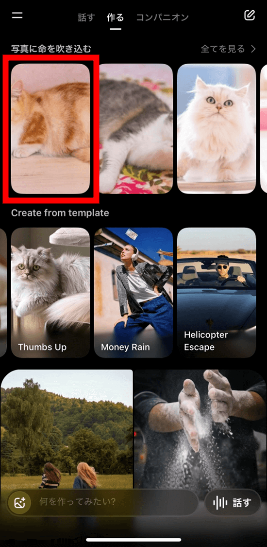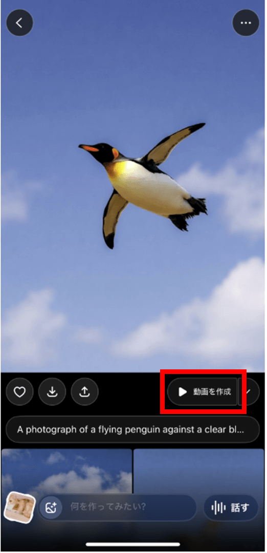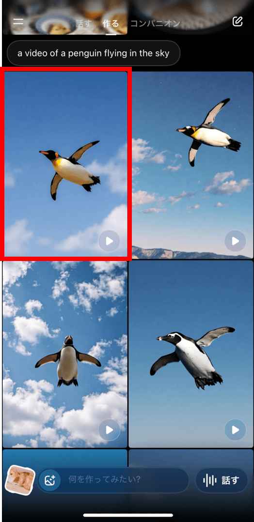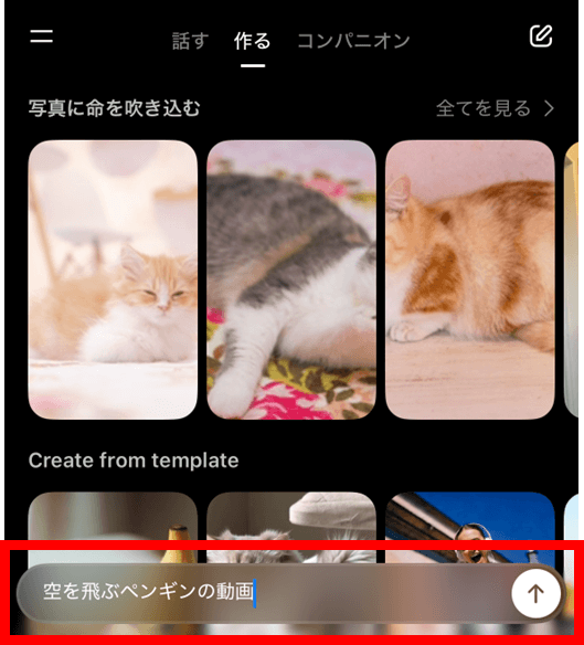 先ほどと同じように「作る」の画面に遷移し、下の入力欄にプロンプトを打ち込みます。