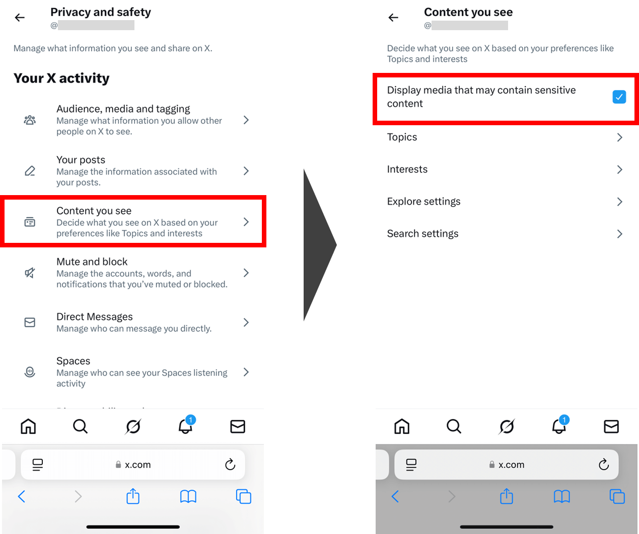 センシティブコンテンツの表示設定は、Xの設定ページ内「Contents you see」のメニューから下のように変更できます。